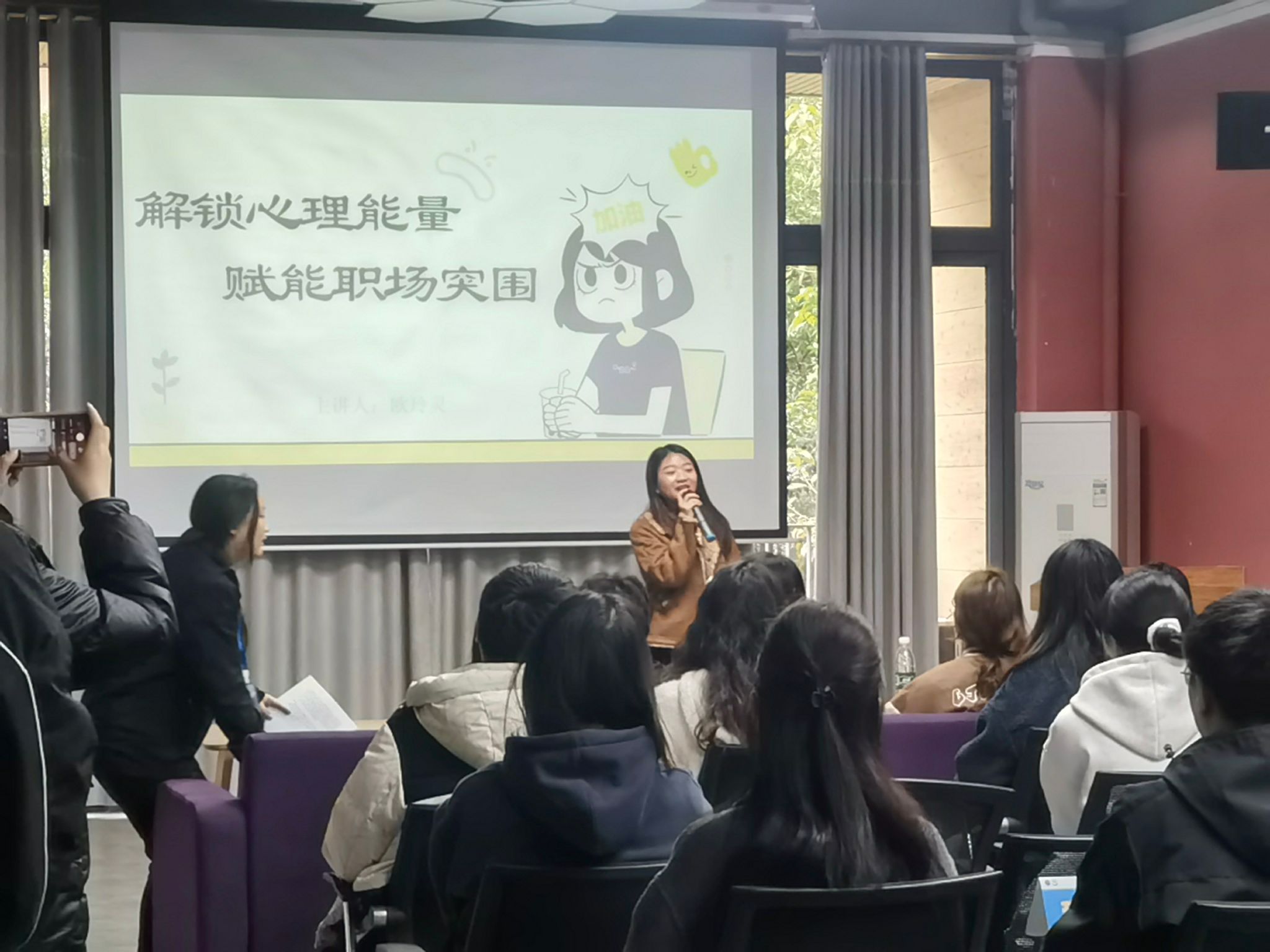 工作室以晨读活动为知识积淀的起点,先后开启职场心理课堂与"学霸零距离" 分享会等主题活动。主题讲座里,欧玲灵老师结合案例剖析职场压力管理,将晨读中培养的专注与思辨力延伸至职业素养培育;实践活动中,携手白鹿社区打造 "行走的课堂",把晨读中诵读的诗词经典转化为与留守儿童互动的文化桥梁,在诗词品读与志愿服务中深化责任意识; "学霸零距离" 分享会把求知精神在朋辈交流中具象化——许文翔同学从自身 "晨读筑基——实践淬炼" 的成长轨迹出发,分享如何将课堂知识转化为实践动能。