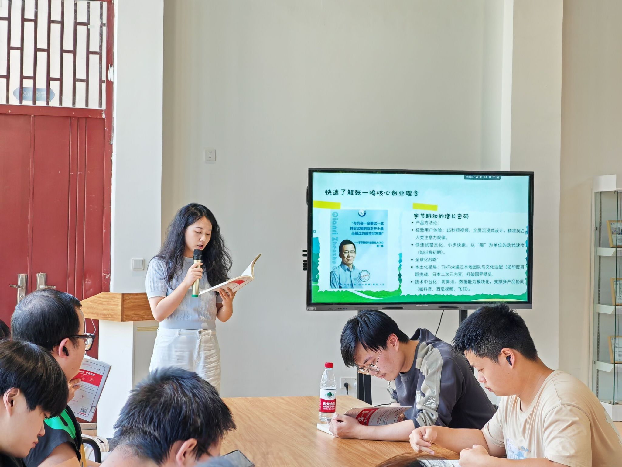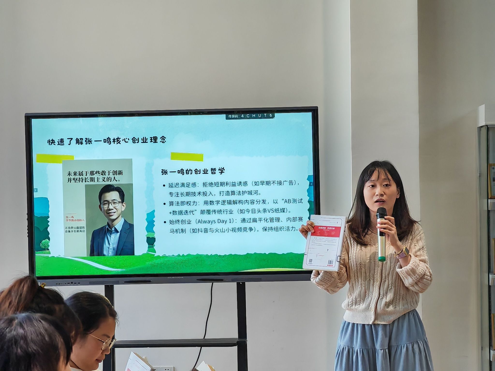 张一鸣身上的“标签”有很多,陶依文老师从延迟满足感、理性与克制、寻找效率最优解、不设边界等切入,深度剖析其如何从一名技术极客蜕变为全球互联网行业领军人物,并系统梳理了字节跳动从0到万亿市值背后的底层逻辑。其中“延迟满足感”是张一鸣身上一直有的一个标签,陶老师分析到,挖掘、满足和释放人性弱点,“大家在刷抖音的时候是否感觉时间过得很快,一天转眼就结束了,明明一个视频长则三、五分钟,短则十几秒,看似不起眼的碎片化时间,积累起来就是三、四个小时的时长”“你的延迟满足感程度更高,你就会耐心更好,标准更高,目标更大,做事更从容专注,不计较眼前的利益,不在意一城一地的得失,一时的成功看得淡,对短暂的失败不恐惧”。这是张一鸣对于成功的独特见解及对后来人的教诲。“快乐”迟一点,幸福才会久一点,沉迷低级快乐,只会让生活变得更加糟糕。“产品经理的思维不是造工具,而是理解人性需求。”在分小组领读环节中,外国语学院李芳同学作为代表以书中“抖音算法逻辑”案例切入,剖析张一鸣“延迟满足”的决策智慧;在小组领读接力环节,书中“大力出奇迹”“Context over Control”等金句引发共鸣,学生们纷纷感慨:“原来字节跳动的成功不仅是技术胜利,更是对人性的精准洞察。”