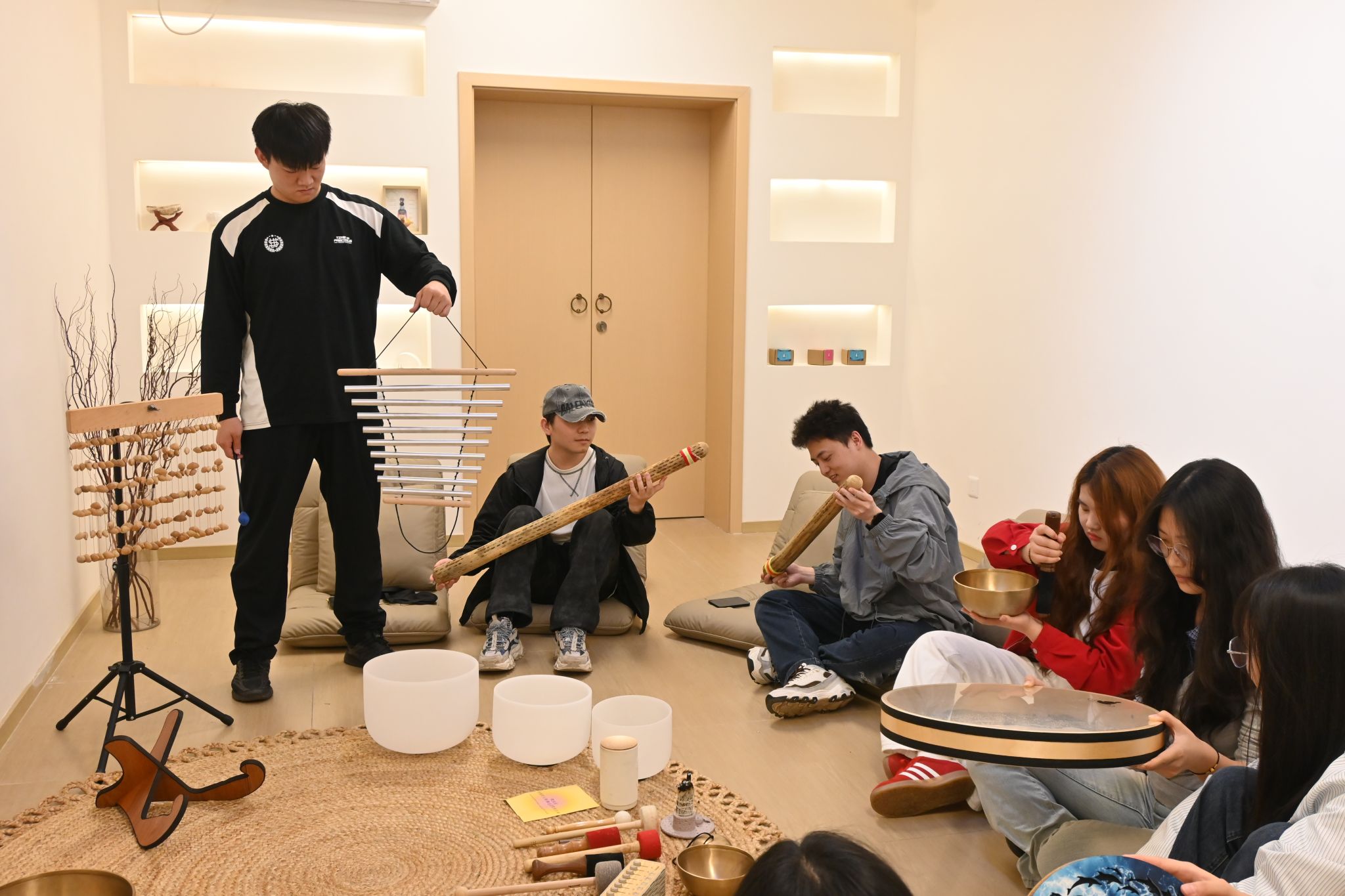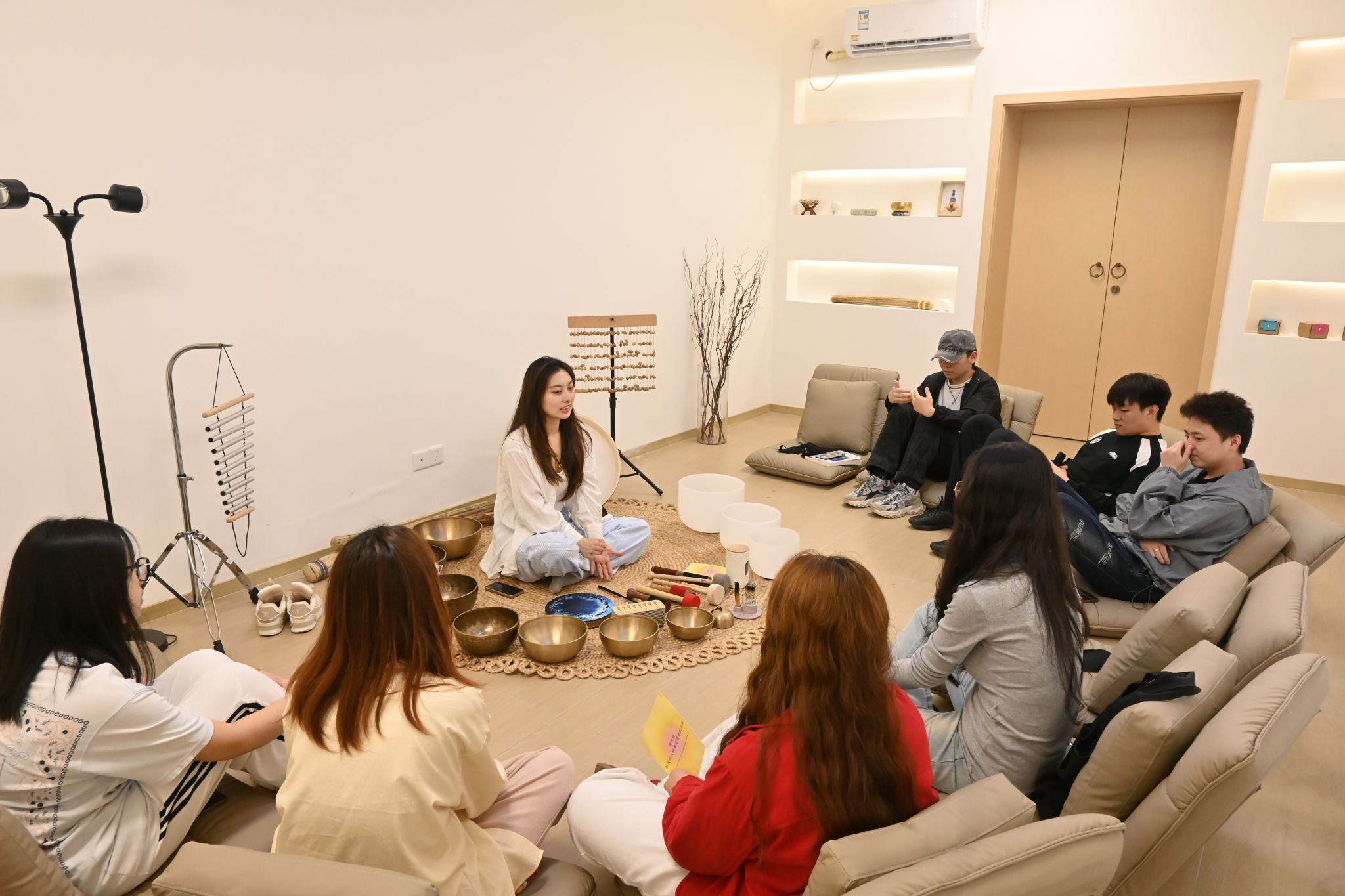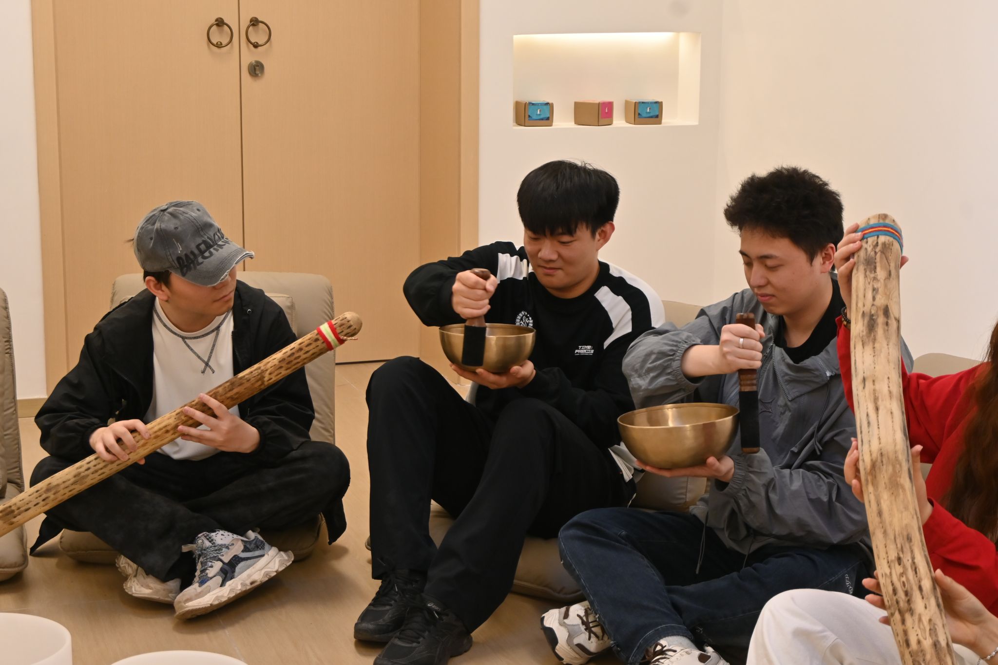 学员们分组练习不同乐器的演奏技巧,并尝试将多种乐器组合,创造出独特的疗愈音景。一位参与培训的心理委员胡佳分享道:"之前我只知道颂钵可以用于疗愈,没想到这么多自然乐器都有各自的疗愈特性。学习如何将它们有机结合起来,我感到自己的疗愈技能有了质的飞跃。"