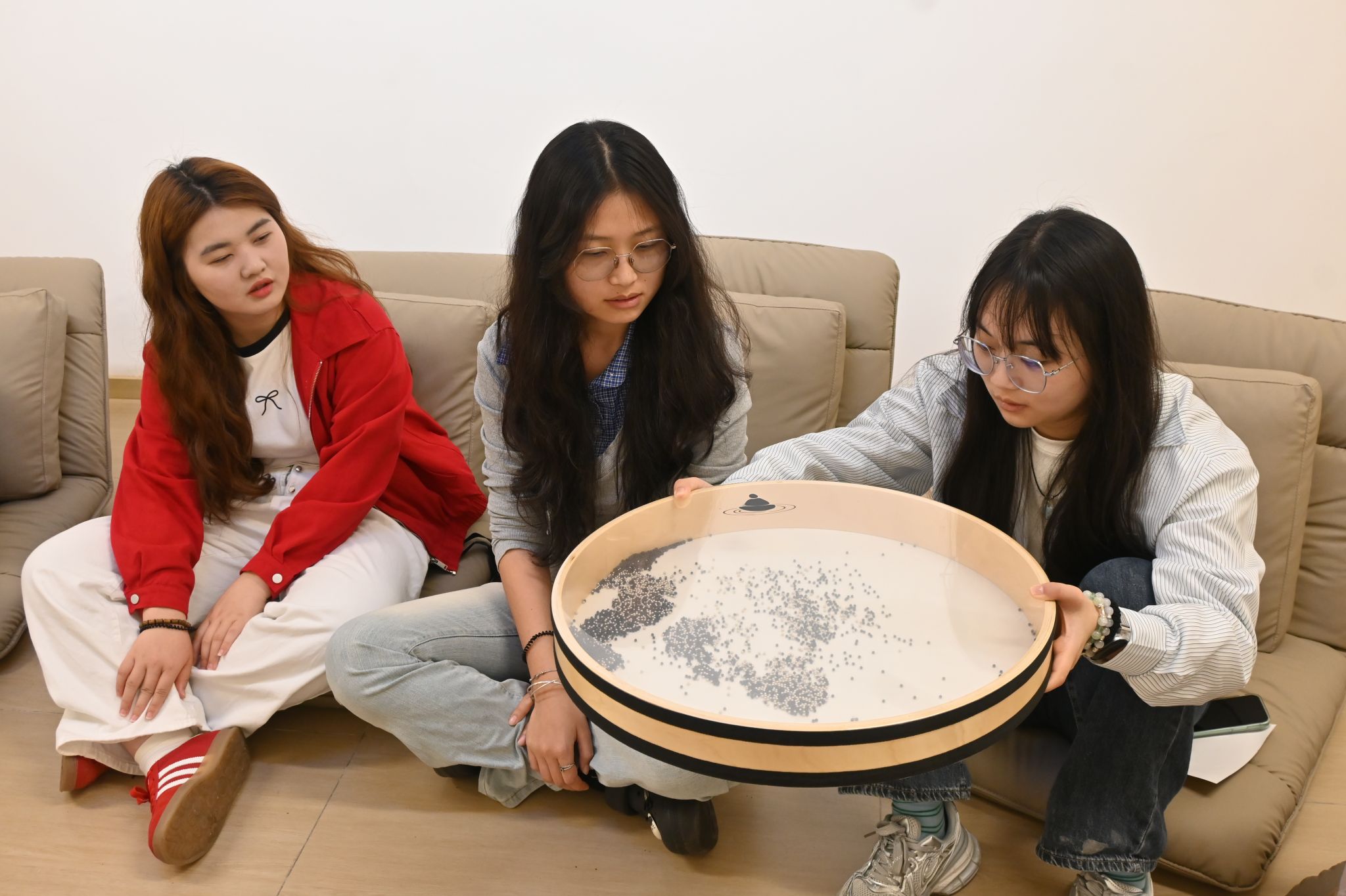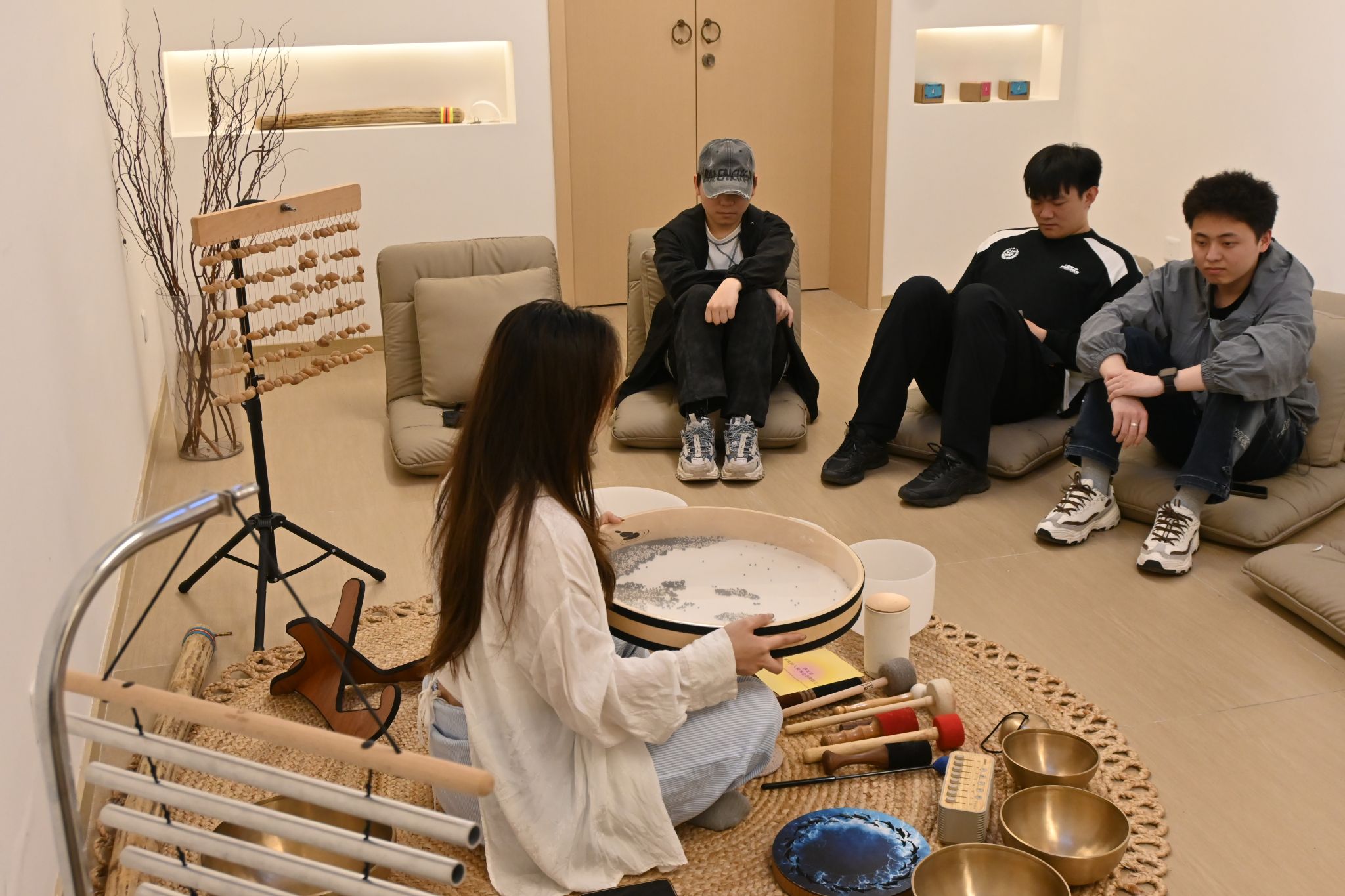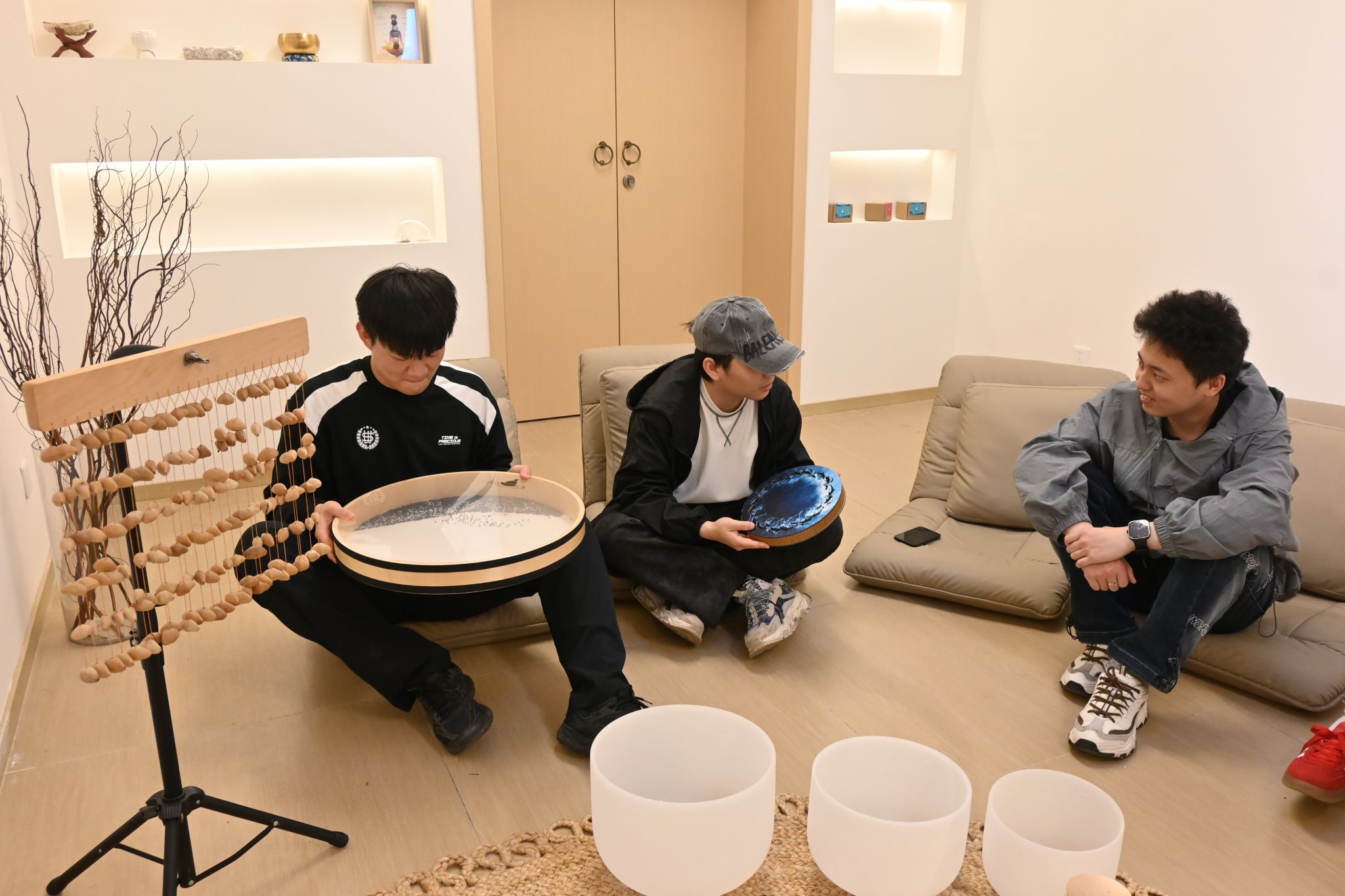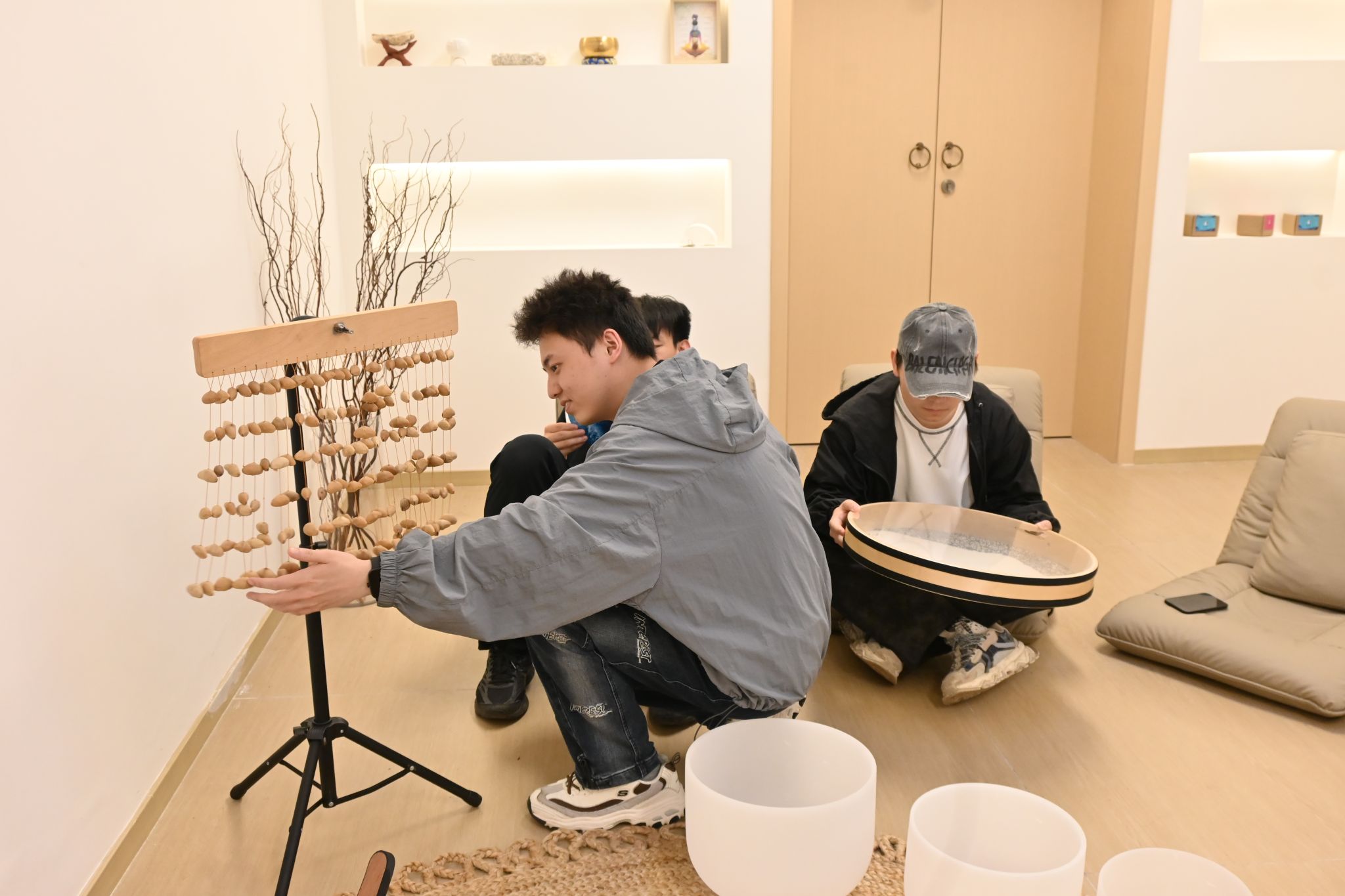 学员们分组练习不同乐器的演奏技巧,并尝试将多种乐器组合,创造出独特的疗愈音景。一位参与培训的心理委员胡佳分享道:"之前我只知道颂钵可以用于疗愈,没想到这么多自然乐器都有各自的疗愈特性。学习如何将它们有机结合起来,我感到自己的疗愈技能有了质的飞跃。"