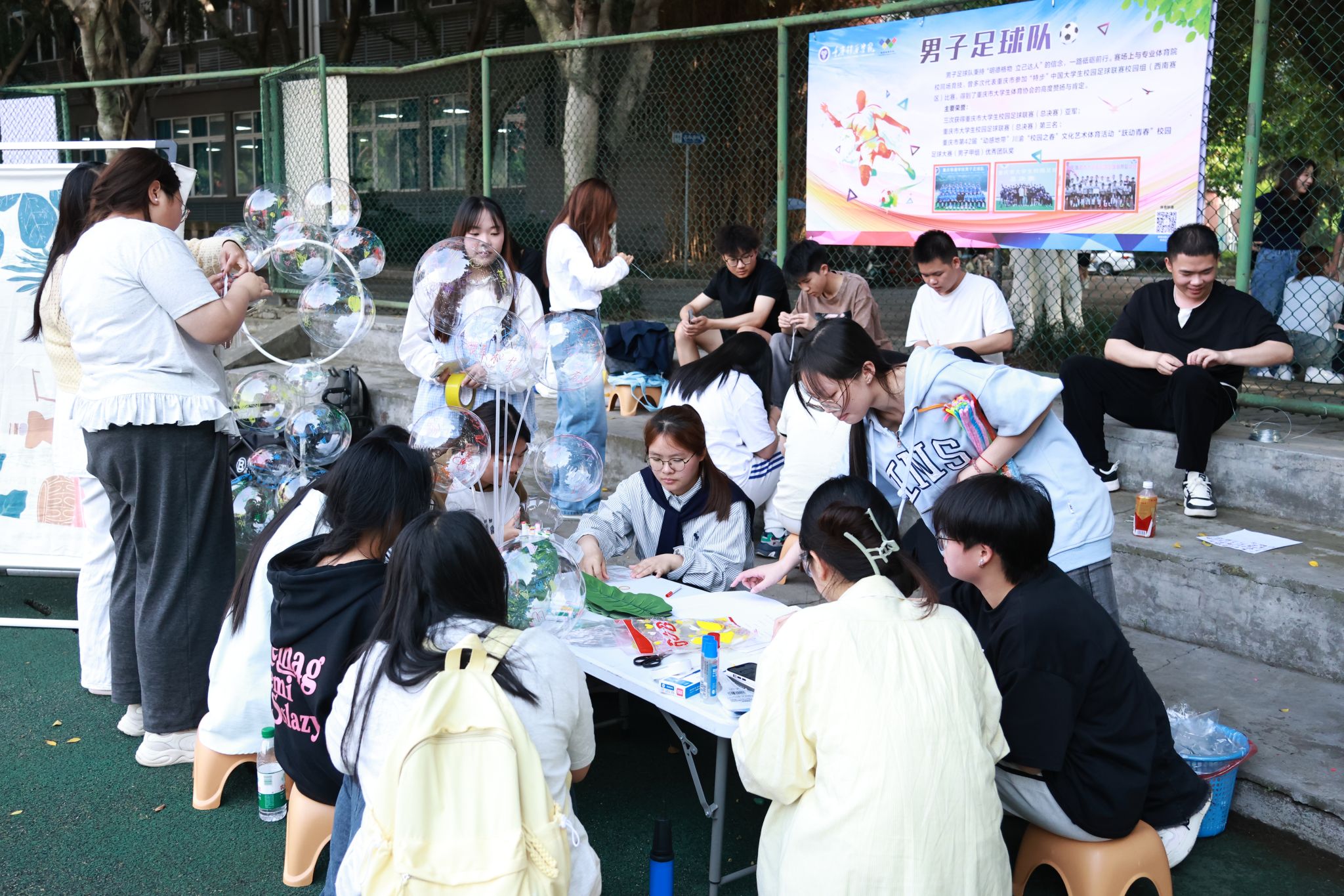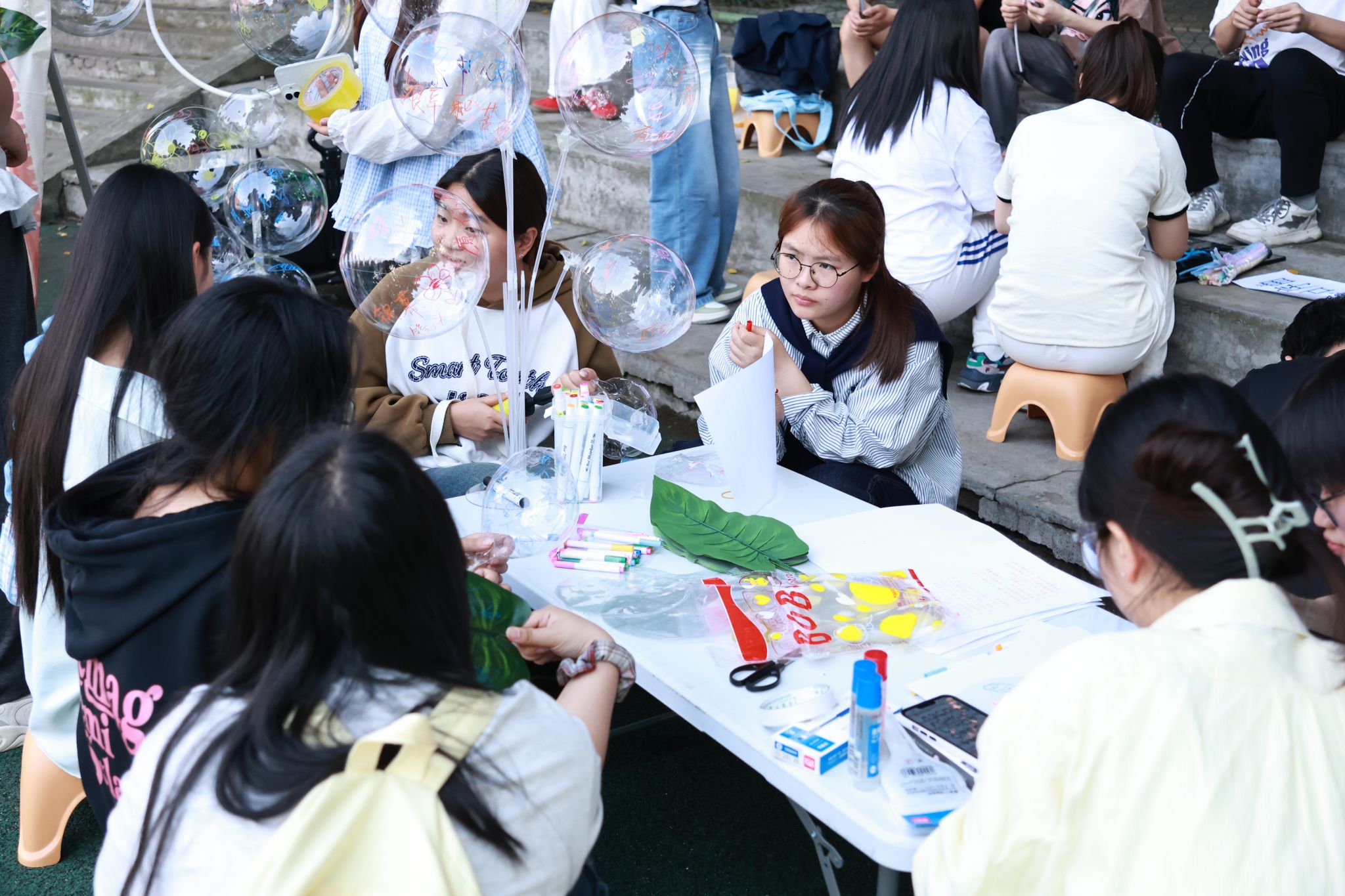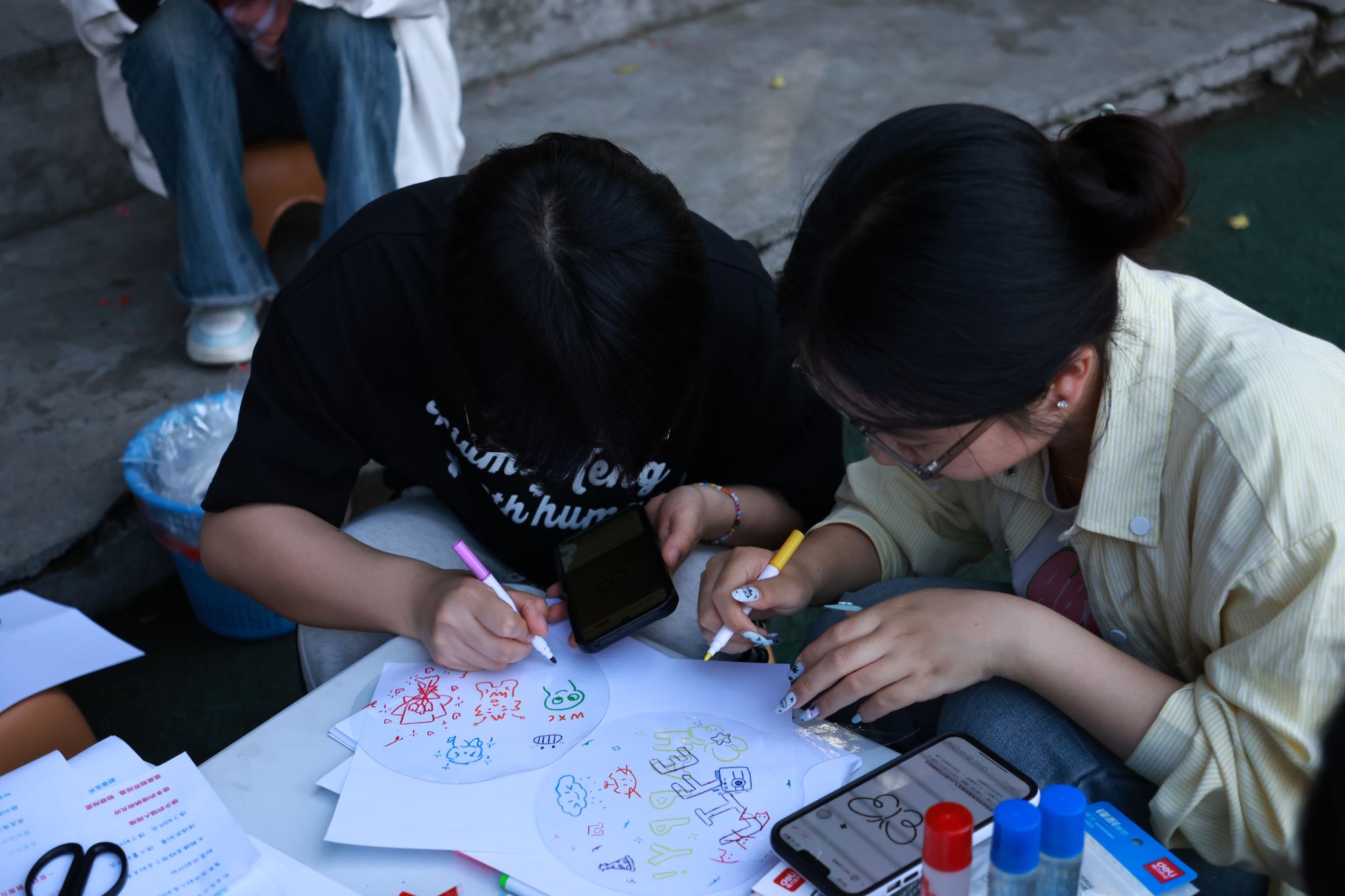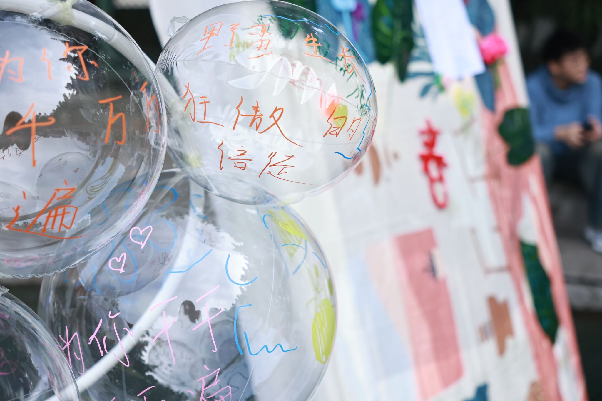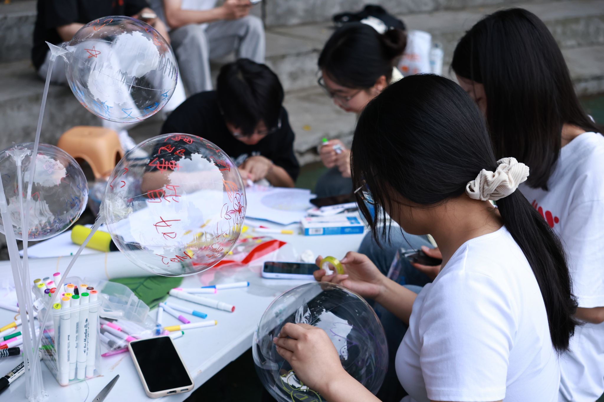 活动现场,气球写诗区域满是同学们专注的身影。参与者手持马克笔,有的盘坐在地面上托腮构思,有的倚着围栏即兴创作,将瞬间迸发的灵感凝结成诗;有的同学目光坚定而充满憧憬,将对未来的美好期许融入笔下。