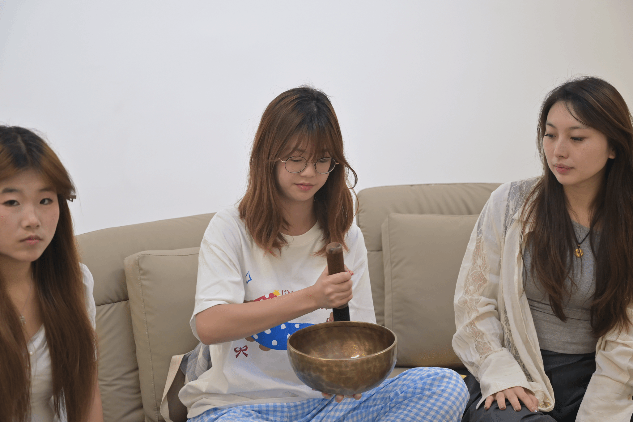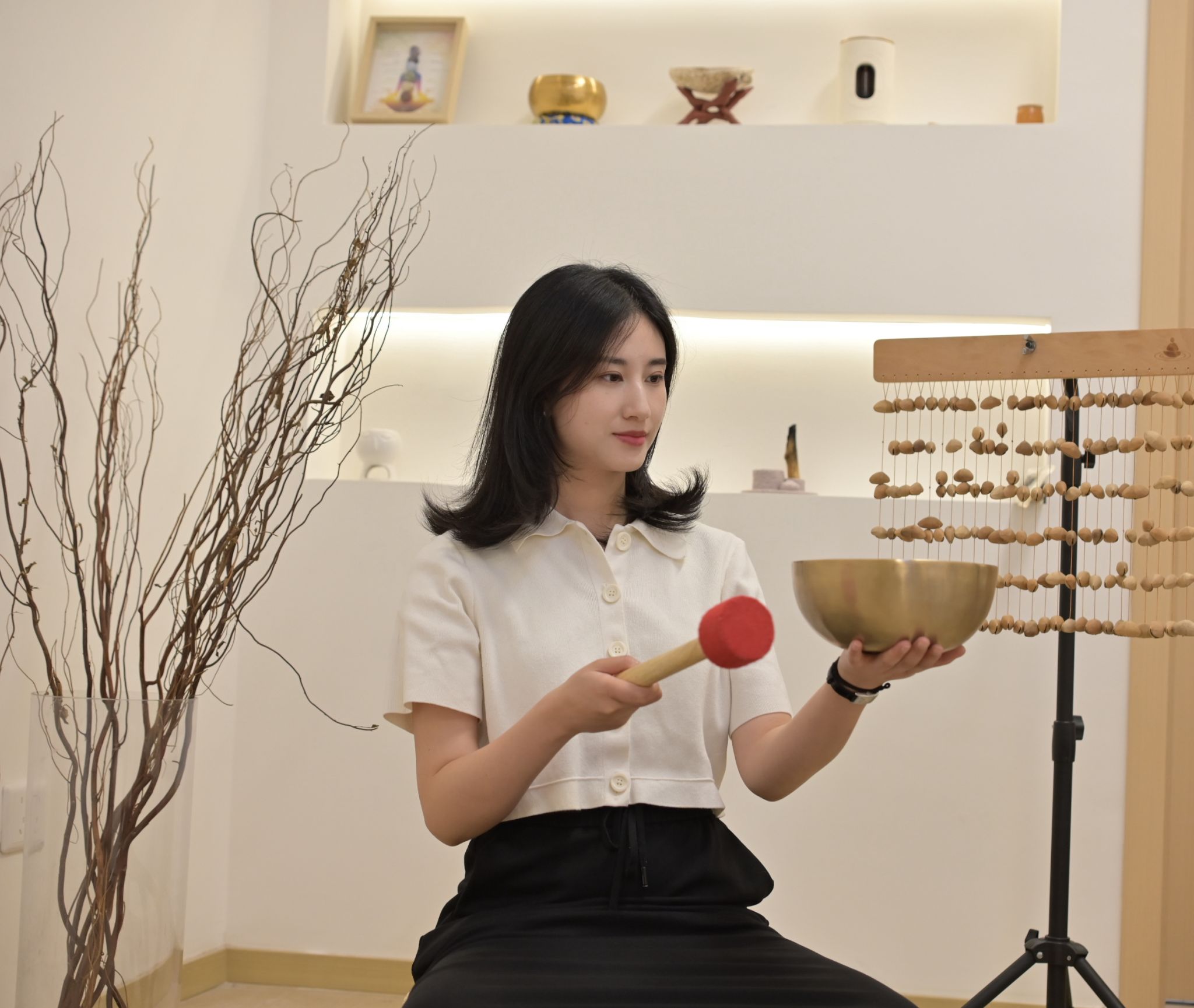 在实践环节,学员们全神贯注地练习各种进阶手法,感受不同技法带来的钵音变化。通过反复尝试,学员们逐渐学会利用颂钵发出的独特声音,引导人们进入深度放松的冥想状态,帮助释放内心深处的压力与负面情绪。