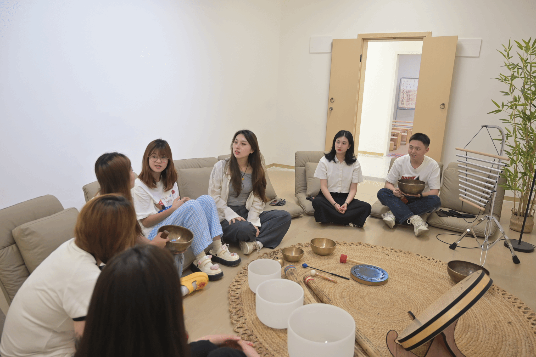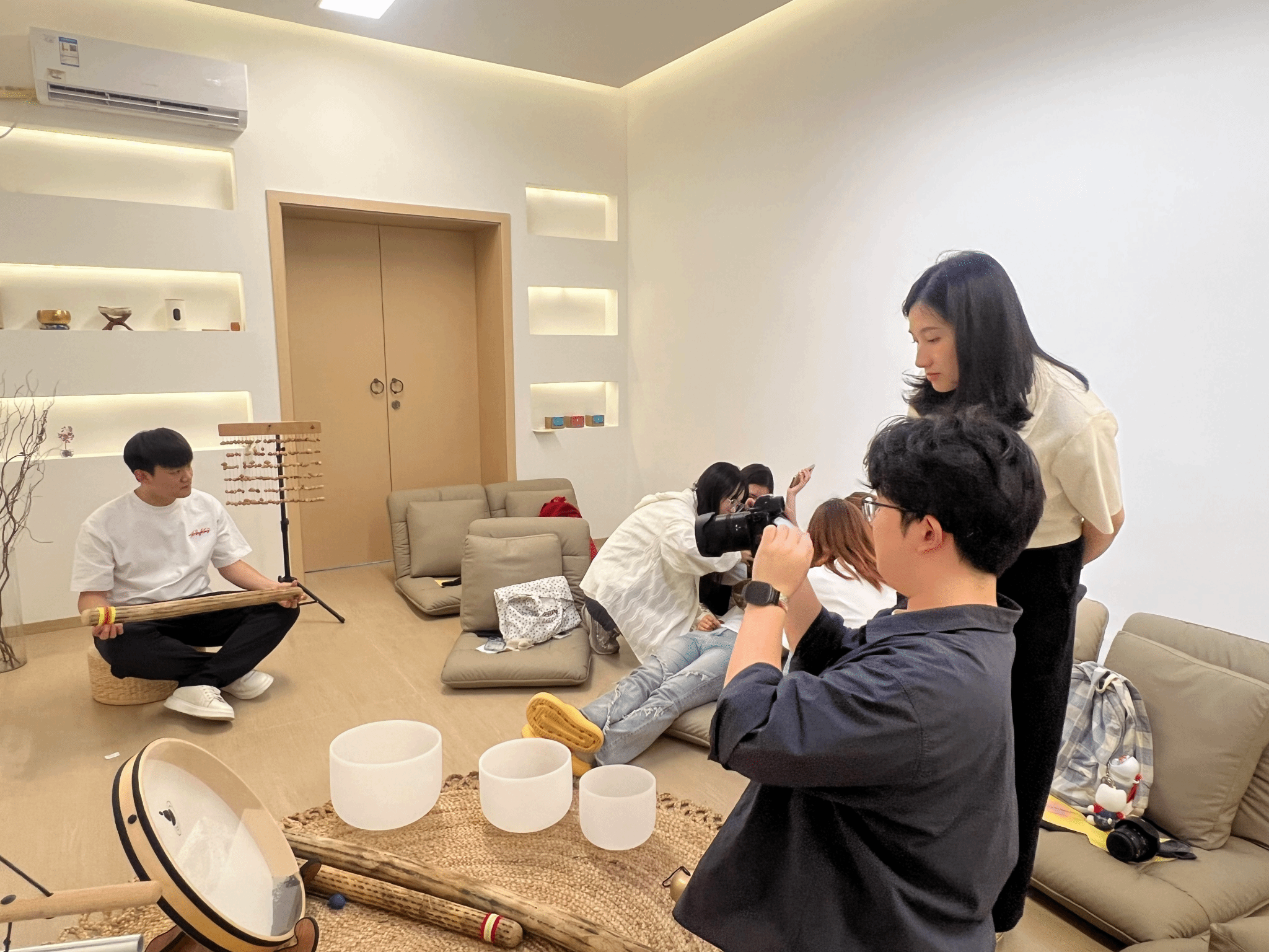 为了让学员们更好地将所学知识应用到实际中,培训设置了实战模拟演练环节。各小组模拟开展一场颂钵疗愈活动,从活动开场的引导、颂钵技法的运用,到与参与者的互动交流,再到活动结束后的总结反馈,每个环节都紧密相扣。