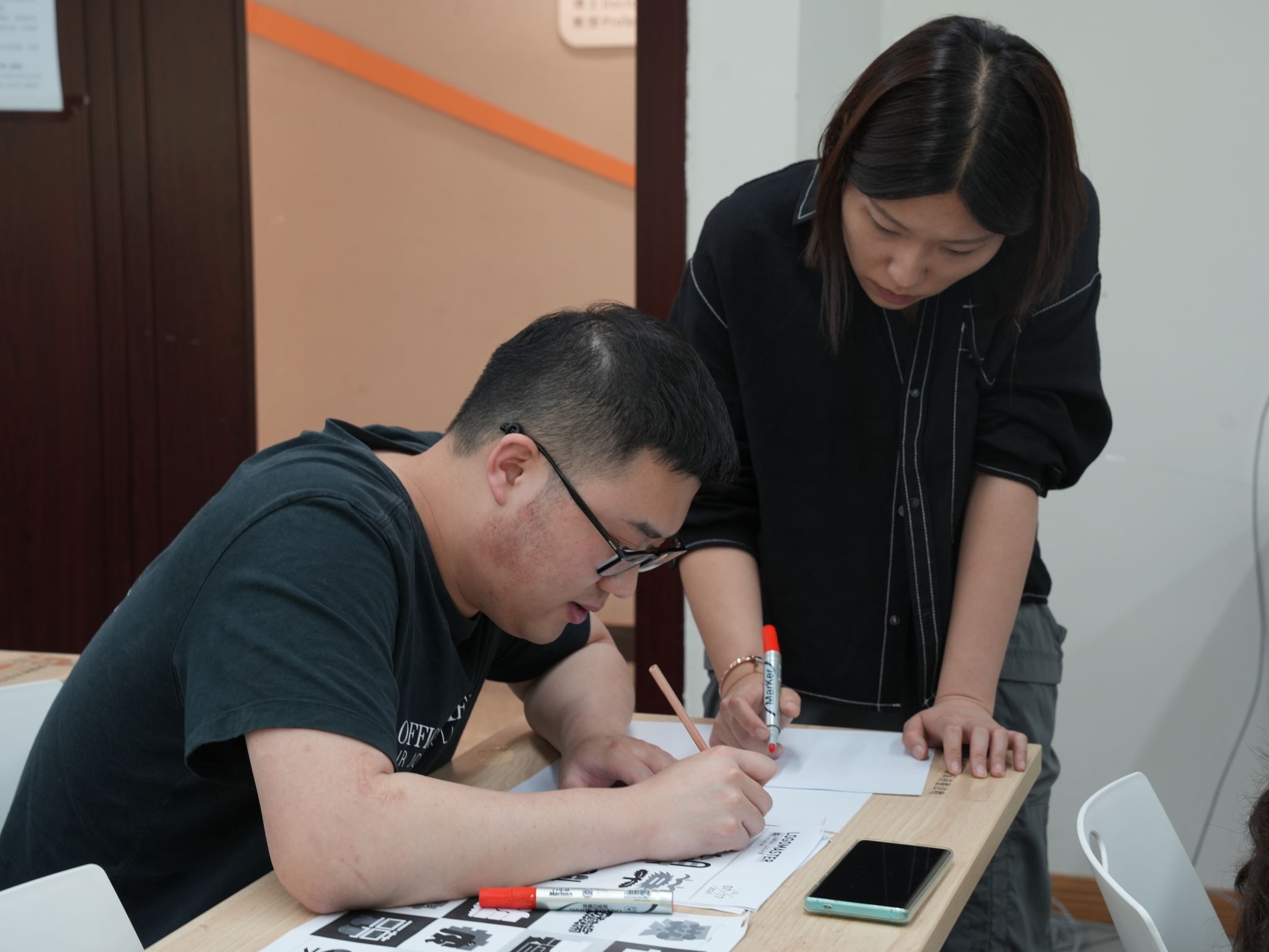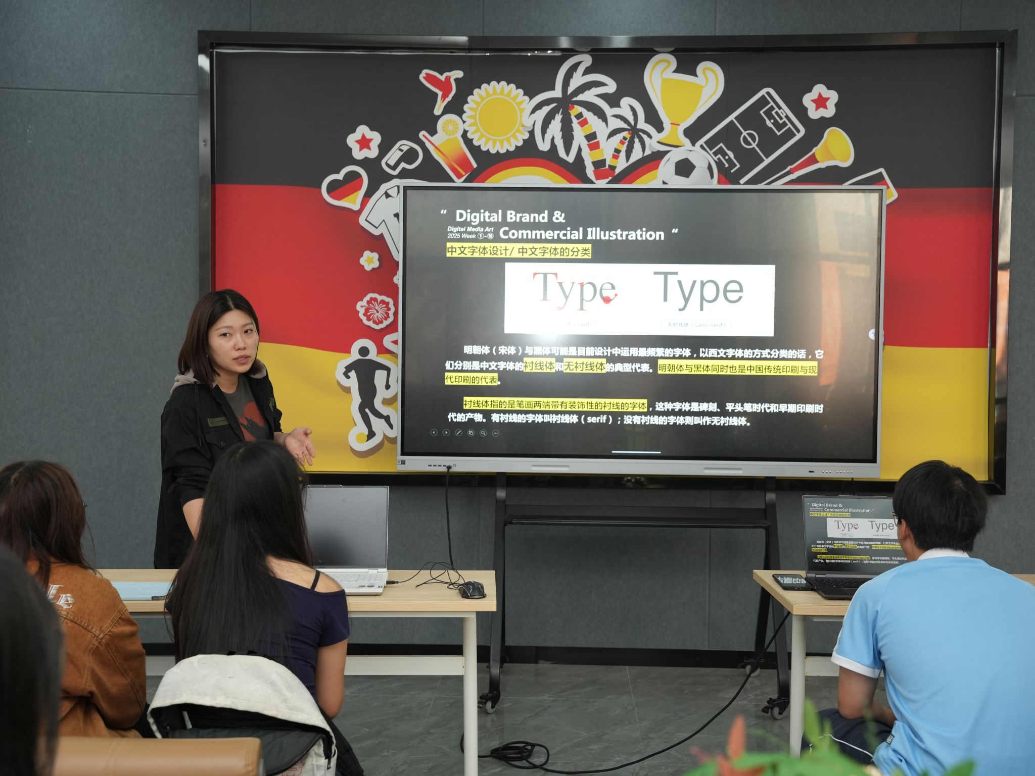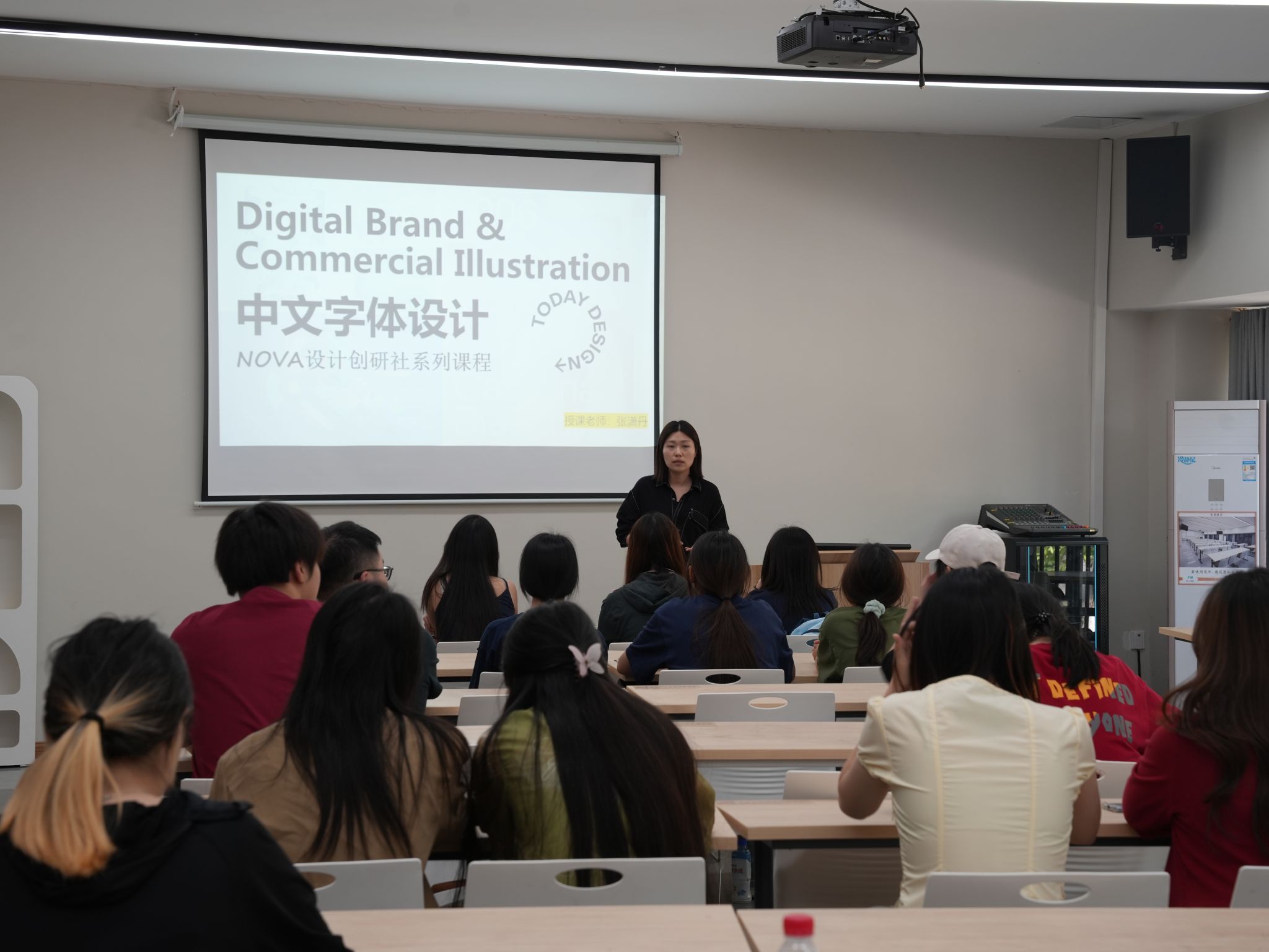 NOVA设计创研社作为南湖书院内充满活力与创意的设计实践工坊,同样通过丰富的讲座和实训项目,为学生搭建起提升设计思维和实操能力的平台。 4月9日及4月16日,南湖书院NOVA设计创研社于中德创意工坊开展“设计无国界,语言会是阻碍吗?”主题活动,张潇丹老师围绕字体设计、版式编排、文创IP开发等方向,结合《诗经》意象与德语谚语的视觉转化案例,解析语言符号与设计思维的融合逻辑,以“理论+实训”模式探索创意设计能力培养,推动学生从“技能学习”向“社会服务”转化。