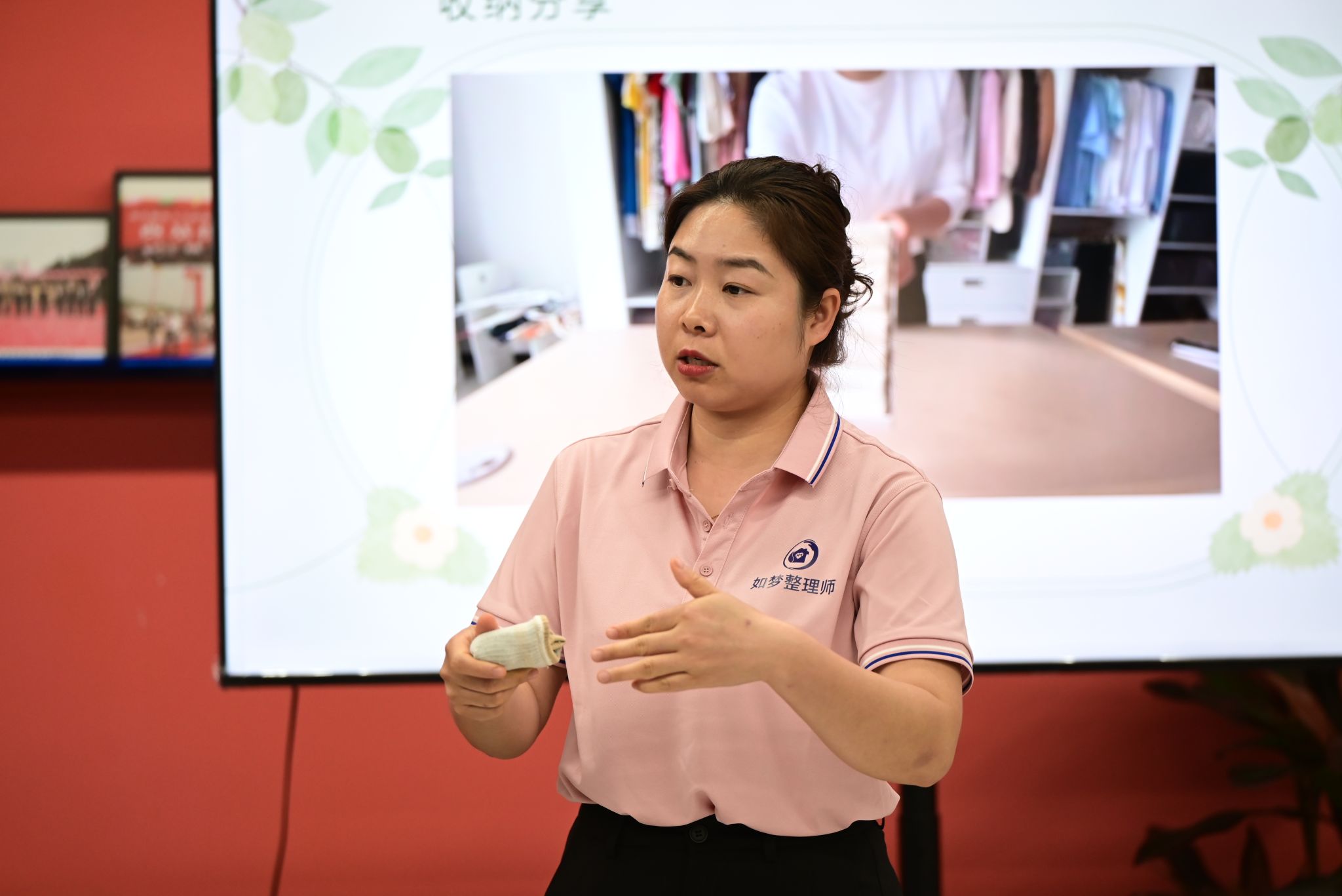 唐春老师现场演示“黄金三角收纳法”“动线优化”“分区管理办法”“3秒叠T恤”等实用技巧。