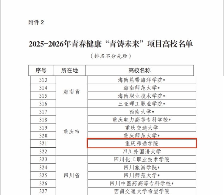 近日,中国计生协青春健康“青铸未来”高校项目评审结果正式公布。由重庆移通学院团委、书院部指导,花果书院申报的“5+N青春健康互助计划”项目从全国600余所高校脱颖而出,作为重庆唯一民办院校成功获批立项,将获得2万元项目扶持经费!
