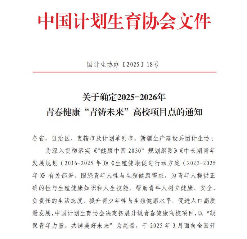 “青春健康”青铸未来"高校项目是中国计生协为落实《"健康中国2030"规划纲要》《中长期青年发展规划(2016-2025年)》和《生殖健康促进行动方案(2023-2025年)》的重要举措,旨在通过创新教育模式提升青年学生的健康素养。