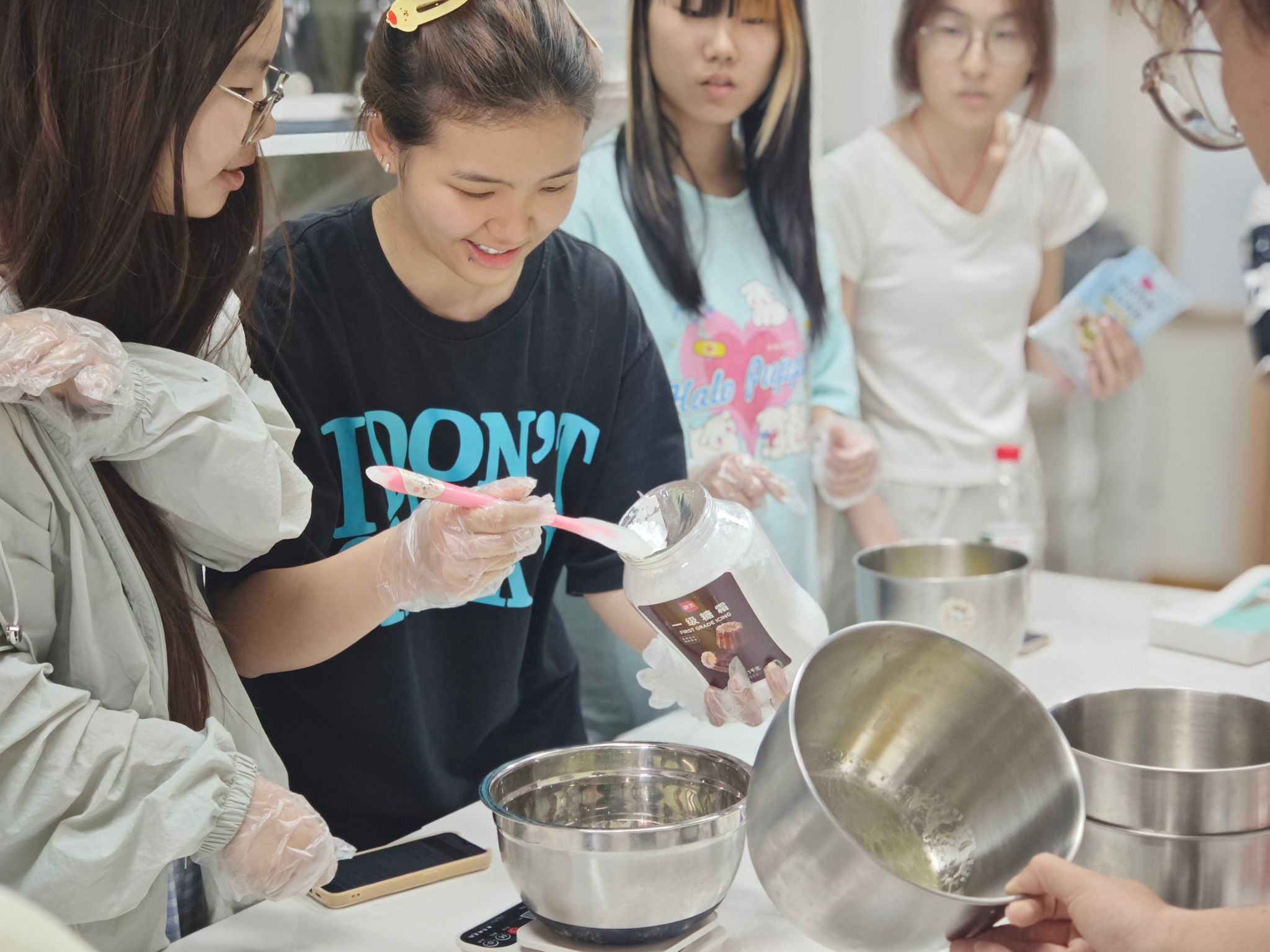 活动伊始,工作人员为参与者们详细讲解了黄油年糕的制作步骤和技巧,详细讲解黄油年糕从原料配比到成型烘烤的全流程,帮助同学们更好地掌握黄油年糕的制作方法。演示结束后,随后在工作人员的组织下,参与者们被分成三组,正式开启DIY之旅,,大家热情高涨,迫不及待地动手尝试。有人严谨称量材料,有人大胆创新造型,更不乏互相指导的暖心场景。制作过程中,大家相互交流、合作,有的同学在调配材料时遇到问题,旁边的同学便热情地分享自己的经验,遇到问题时,会主动向身边的同学或工作人员请教,通过这样的生活技能实践与体验,让同学们在动手实践中培养耐专注力和团队协作精神,工作人员也在现场时刻关注同学们的制作进度,及时提供帮助和指导,确保每位同学都能顺利完成作品。