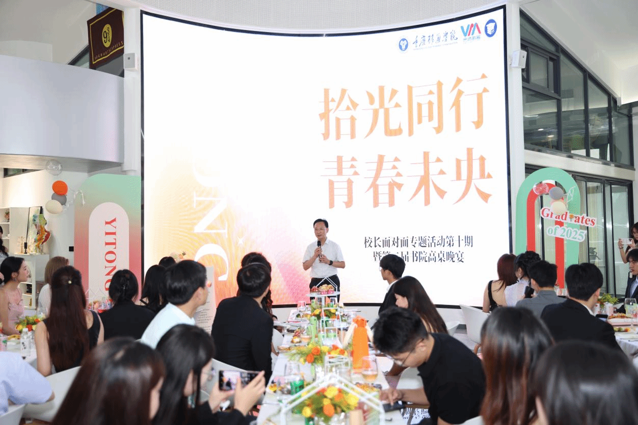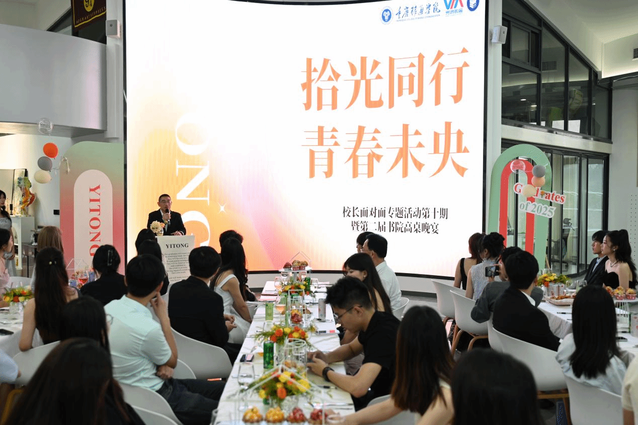 2025年5月21日,重庆移通学院合川校区钓鱼城科幻学院UFO内灯光璀璨、笑语盈盈,以“拾光同行·青春未央”为主题的校长面对面专题活动第十期暨第二届书院高桌晚宴在此温情启幕。本次活动由书院部主办、学生书院联合会承办,特邀校领导、各书院导师代表及39名毕业生齐聚一堂,通过高桌晚宴的仪式感与互动交流的温情,为2025届书院毕业生们镌刻青春记忆,传递书院“家文化”的温暖,助力学子以从容姿态迈向人生新程。