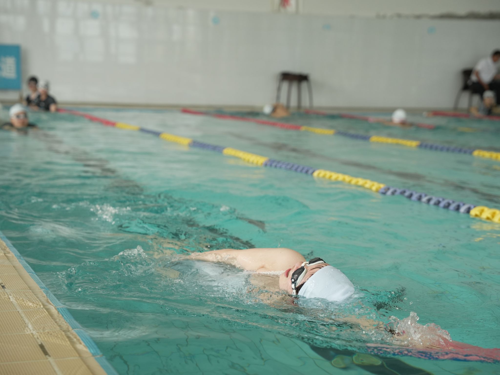 在实践练习阶段,学生们佩戴好装备,有序下水。王老师和助教团队穿梭在泳池边,密切关注每位学生的动作,及时给予指导——“头部入水时要保持流线型,避免抬头过高。”“手臂划水要像抱水球一样,连贯发力……”在教练们的悉心指导下,学生们从最初的小心翼翼,逐渐变得自信从容,在水中的动作也越发流畅。