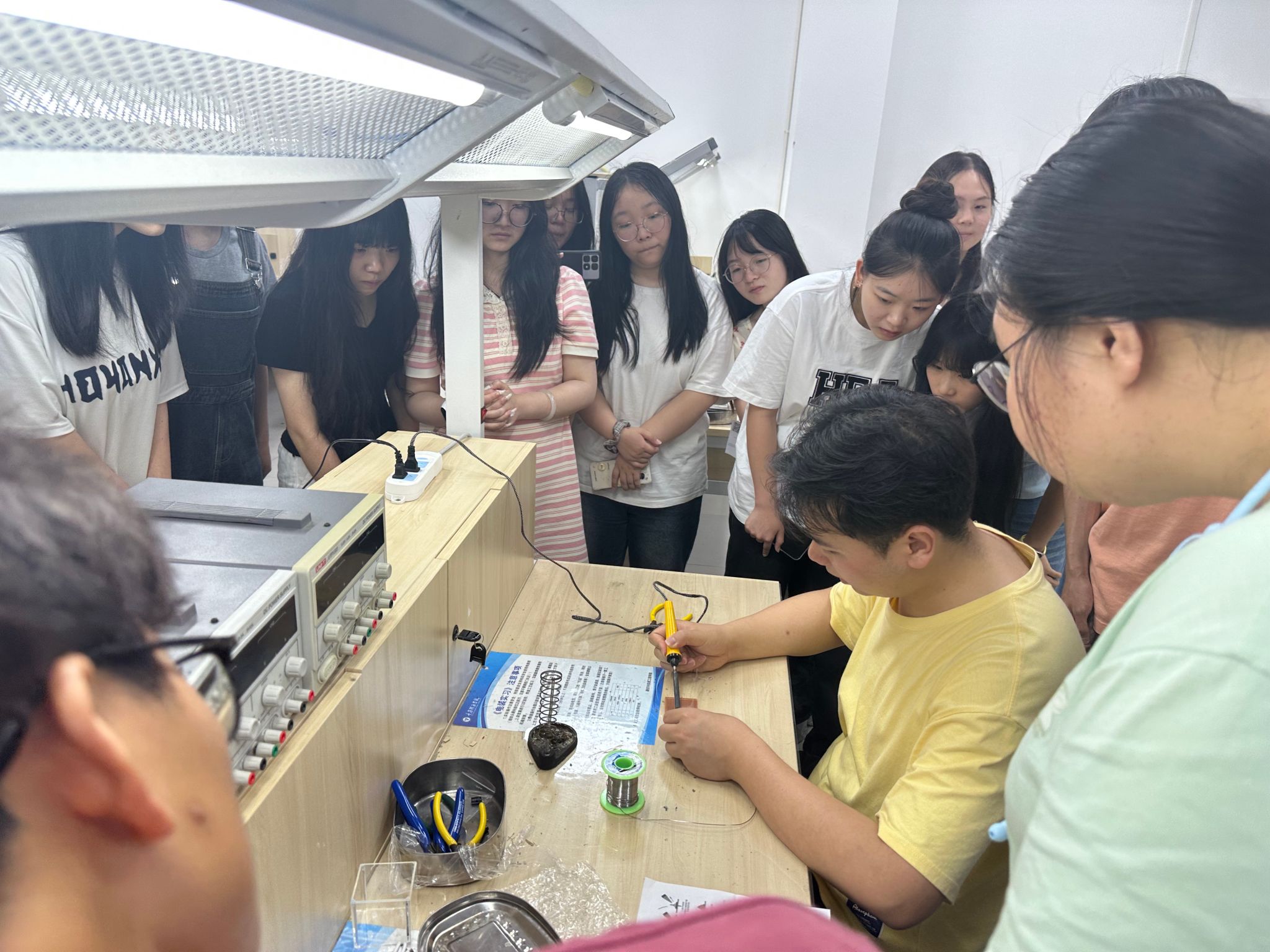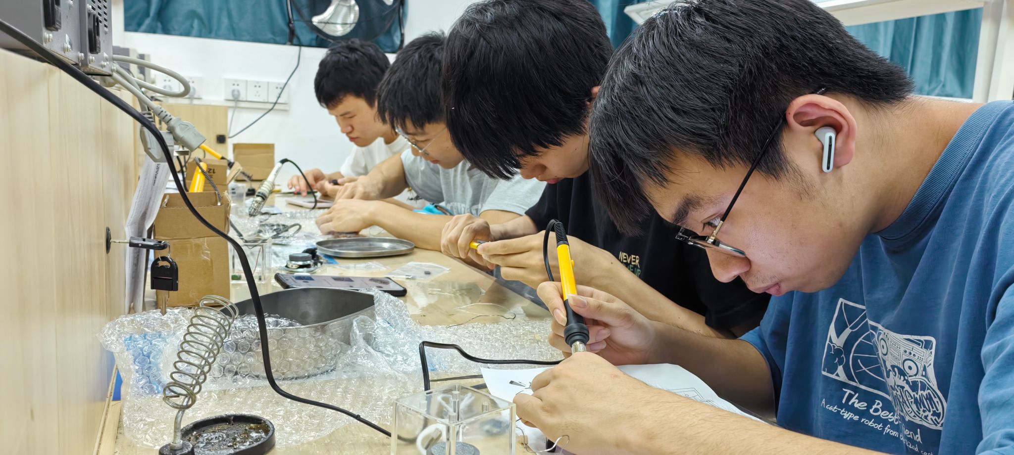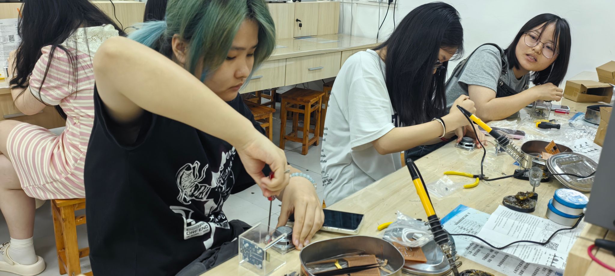 随后,同学们正式开始实践操作。尽管动作略显生疏,但大家都全神贯注,小心翼翼地将一个个电子元器件焊接到电路板上。焊接过程并非一帆风顺,有的同学因焊接温度控制不当导致元器件虚焊,有的同学则在复杂的线路连接上遇到困难。然而,在导师们的及时帮助和鼓励下,同学们不断尝试、调整,逐渐掌握了焊接技巧。随着一个个焊点成功固定,电路板上的元器件有序排列,同学们的脸上洋溢出自信的笑容。