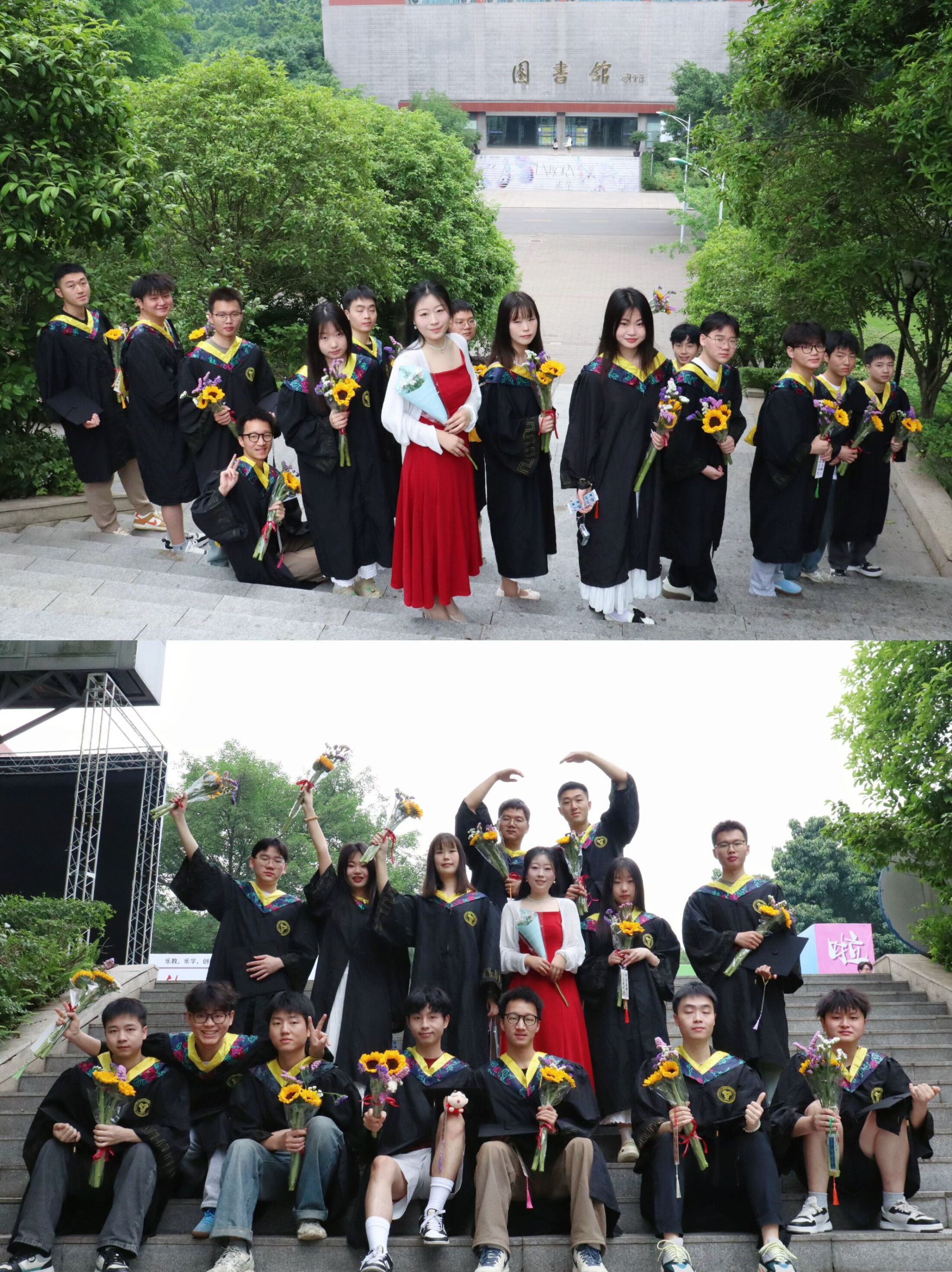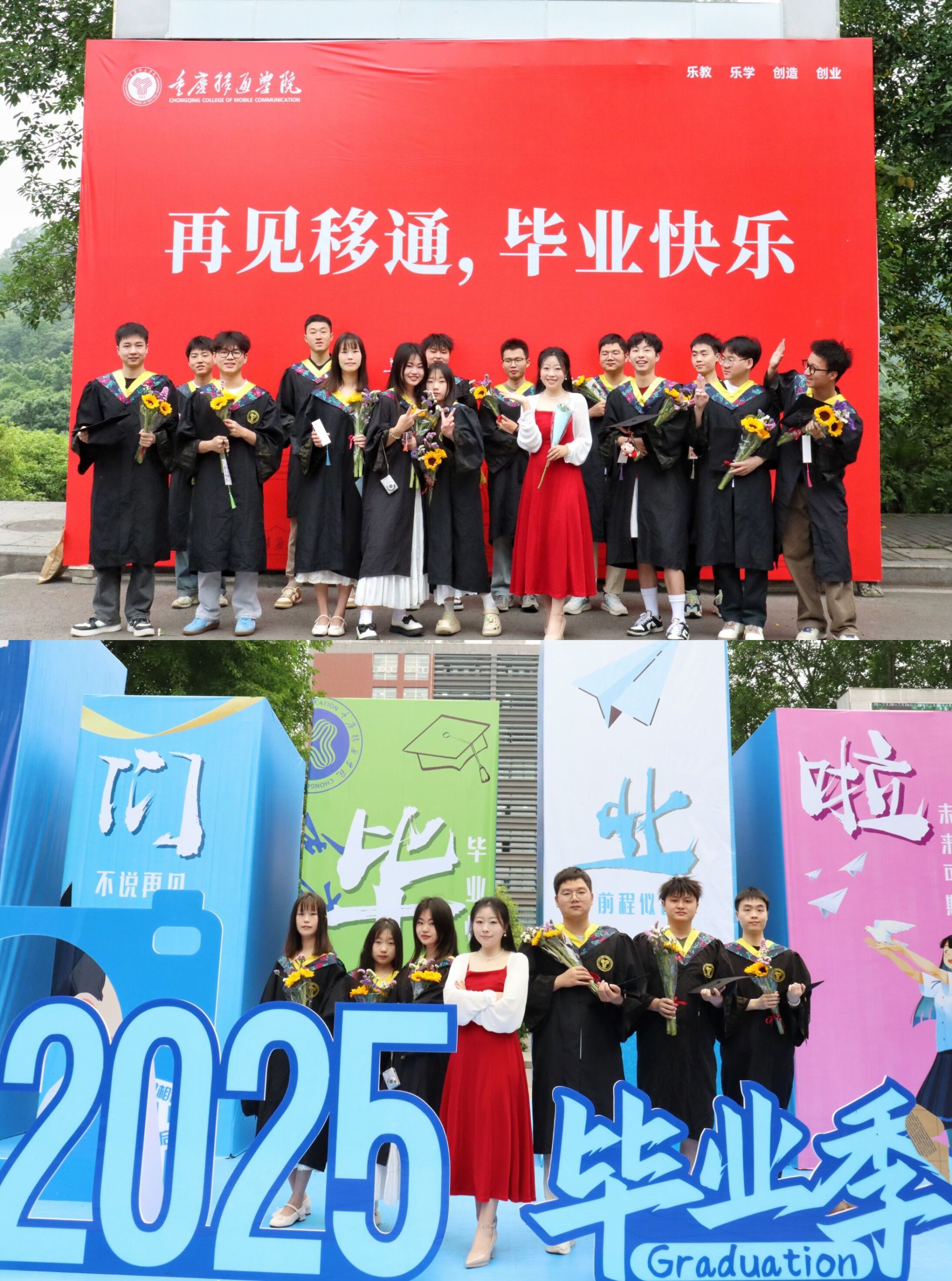 仲夏蝉鸣,栀子花开,又是一年毕业季。异科导师黄晓艳策划了一场充满温度的毕业仪式。黄老师带着亲手制作的三十余份毕业花束和毕业书签,与同学们共拍创意合照,用匠心与温情为学子们送上离校前的“最后一课”。黄老师选定象征希望与坚韧的向日葵为主花材,搭配勿忘我与定制烫金丝带,在合照前夜将三十余支鲜花逐一修剪、编织成束,希望同学们像永怀希望和热情,逐光前行。除此之外,黄老师还特意为大家制作祝福卡片,细心地把彩带和卡片串连起来,组成了厚厚一叠五彩的书签,以期学生如这书签祝福语一般幸运、美好。“向日葵向阳而生,书签载梦而行”,愿这些带着温度的礼物,能成为大家闯荡世界的勇气勋章。
