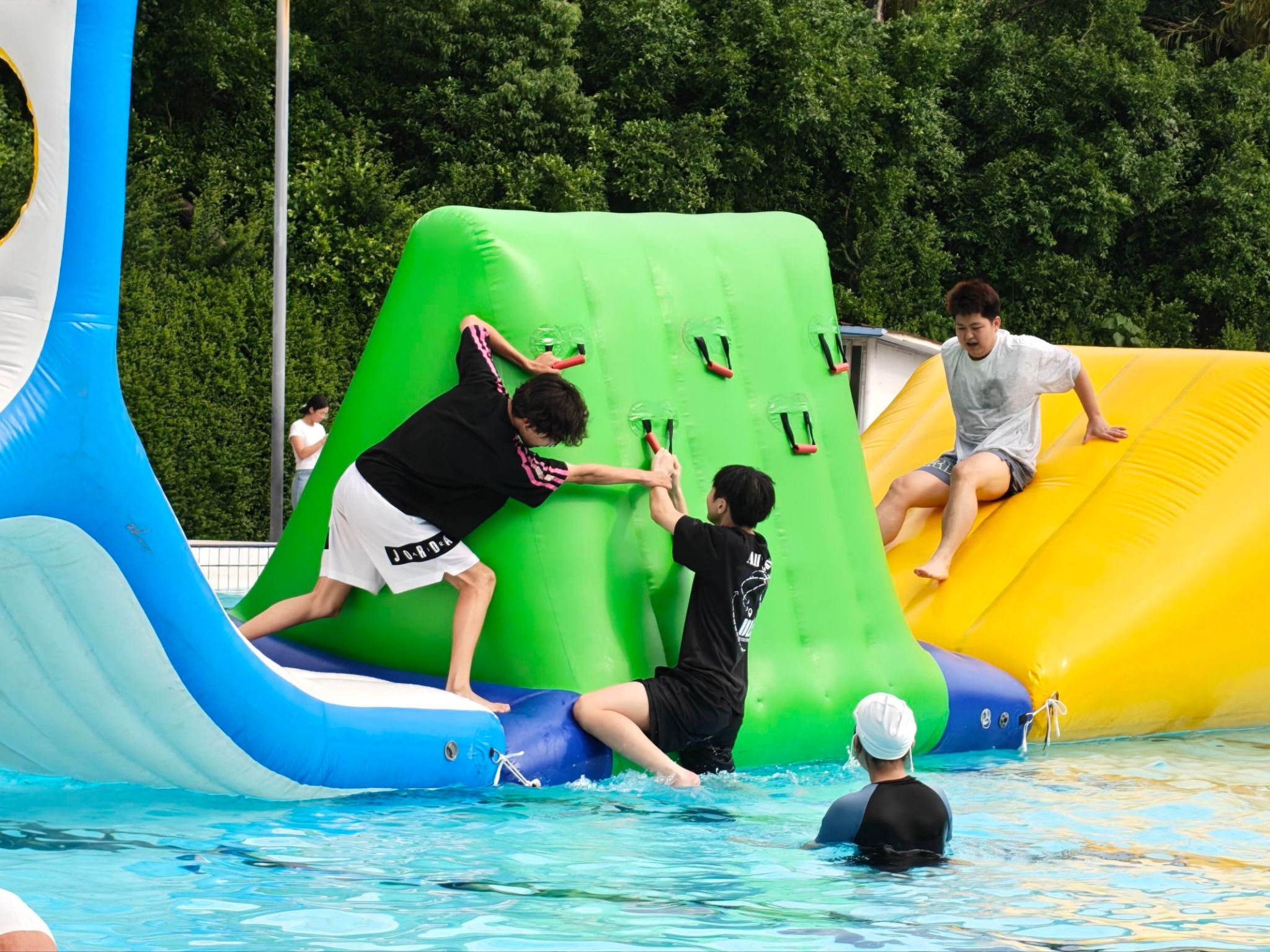 学生赛道以寝室为单位展开激烈角逐。陆地项目中,“同舟共济”考验步伐一致的合作精神,“穿越火线”则挑战身体的敏捷与胆量;水上关卡更是高潮迭起,“激流勇进”溅起阵阵水花,比拼的是平衡与速度,而“乘风破浪”环节则需要整个队伍齐心协作、共渡难关。参赛同学们不仅在闯关中展现出出色的体能和敏捷身手,更在一次次互助与鼓励中深化信任、凝聚共识。尤其在一些特别设计的障碍环节,如需要忍耐与配合的指压板通道、低身钻越的绳网阵等,每一处都成为团队毅力与默契的试炼场——嘶吼声、欢笑声、助威声此起彼伏,青春的张力燃爆全场。这场闯关,不仅是新老生破冰融合的良机,更是寝室这一校园“最小共同体”凝聚力的生动诠释。