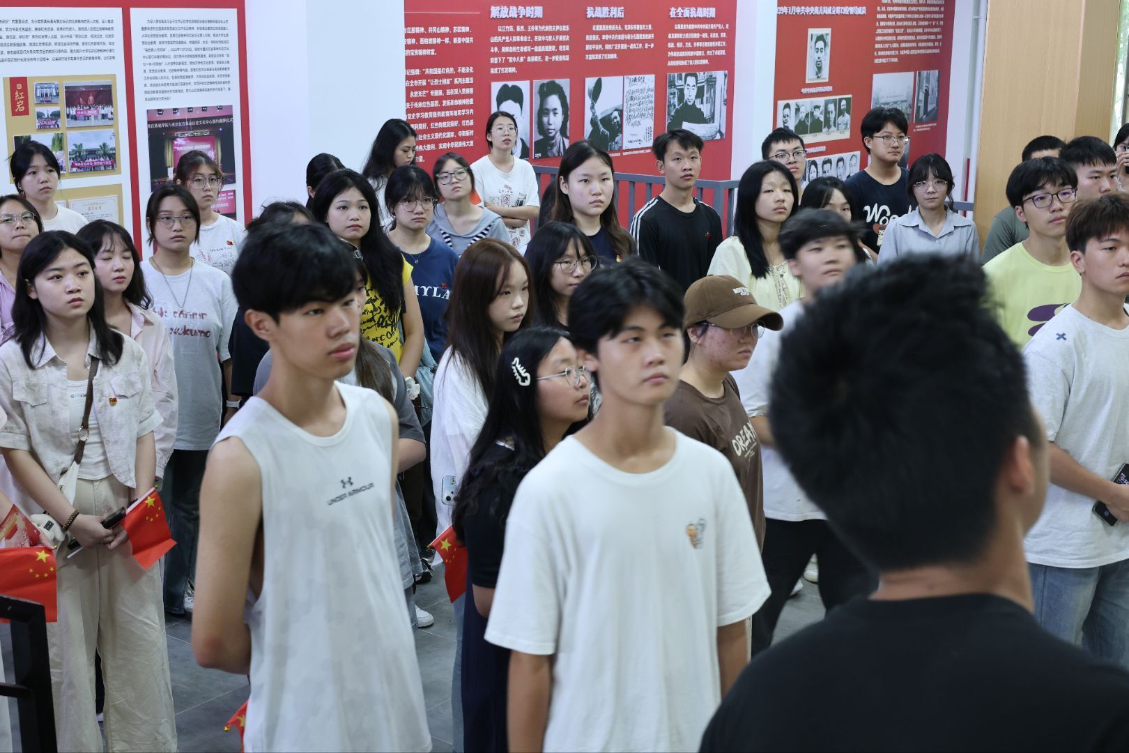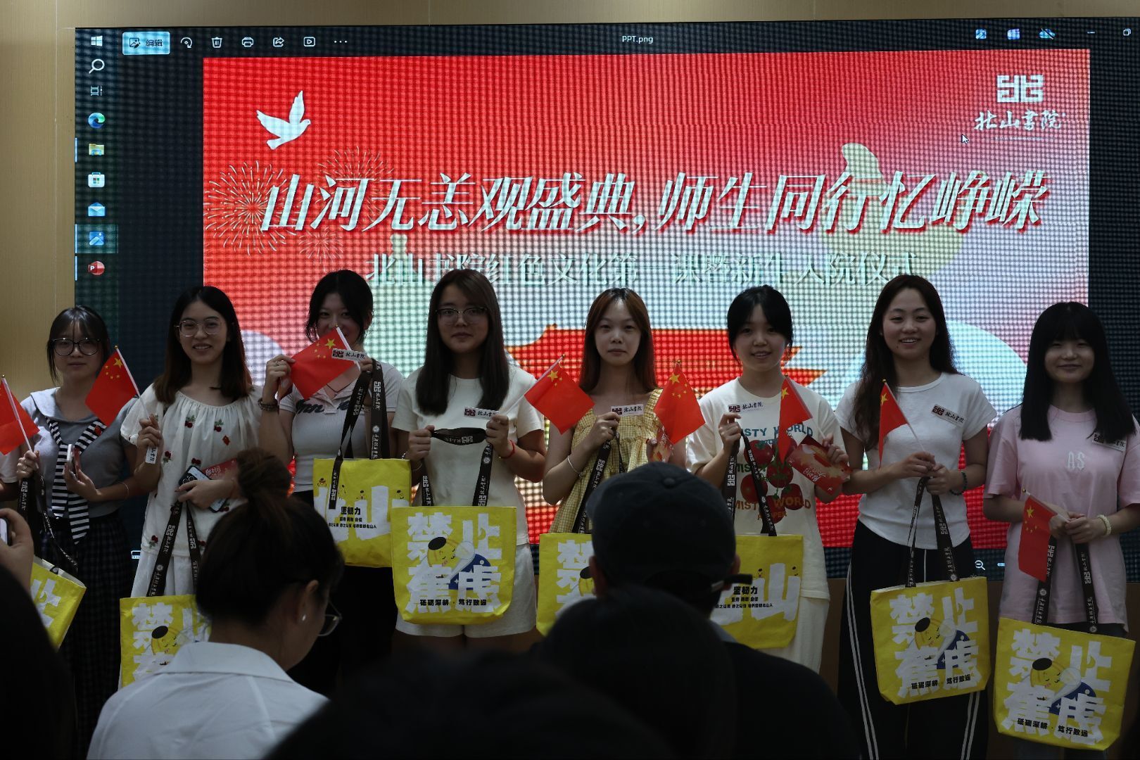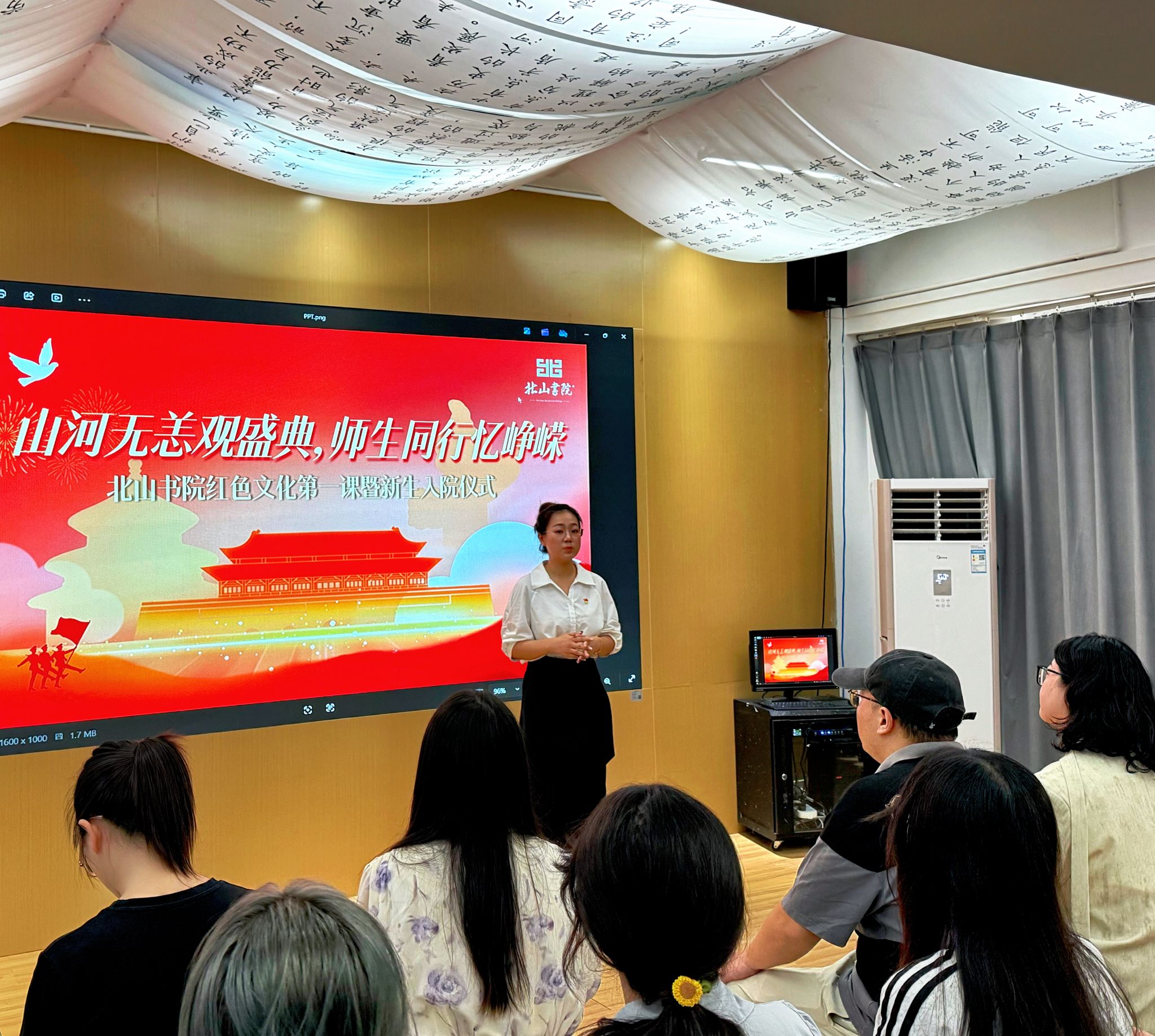 2025年9月3日,正值中国人民抗日战争暨世界反法西斯战争胜利80周年纪念日,北山书院与外国语学院、通信与信息工程学院、智能工程学院联合举办了一场主题为“山河无恙观盛典,师生同行忆峥嵘”的北山书院红色文化第一课暨新生入院仪式。2025级新生踊跃参与,现场气氛既庄重又温暖,洋溢着浓厚的集体归属感。