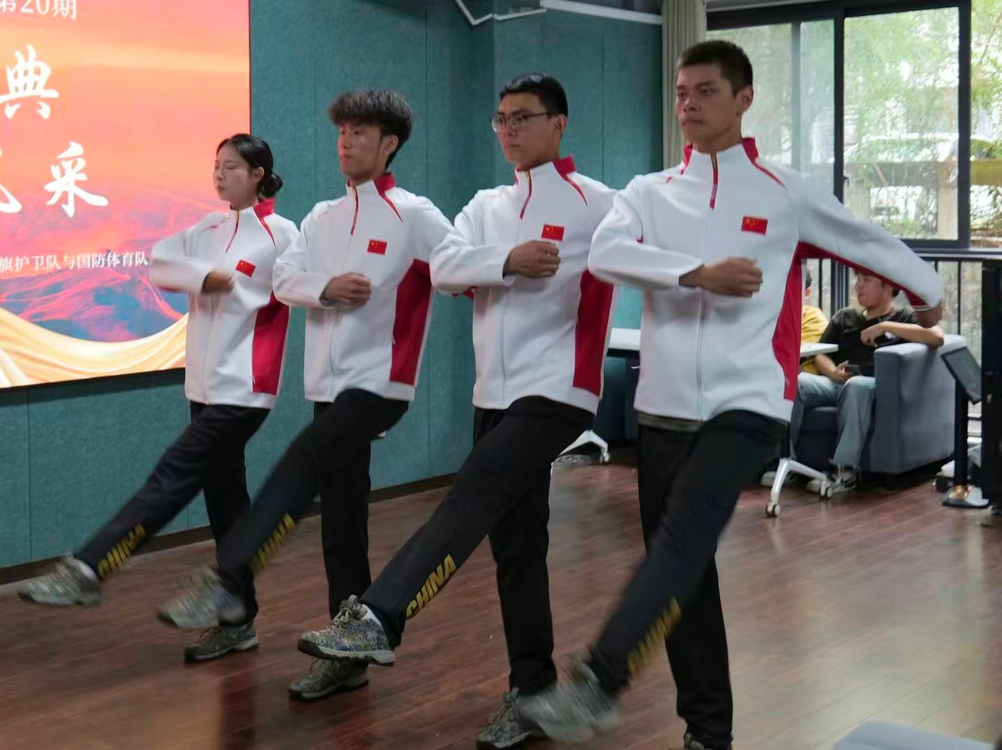 接下来的实践环节将活动推向新的高潮。来自竞技体育中心的校国旗护卫队与国防体育队同学们进行了精彩的队列展示,他们迈着铿锵有力的步伐,动作整齐划一,眼神坚定有力,完美展现了当代青年学子的精神风貌和严明的组织纪律性,赢得了全场热烈的掌声。随后,护卫队成员邀请两名同学上台,现场指导军姿站立要领。"挺胸、收腹、下颌微收、双手紧贴裤缝线",在护卫队同学的耐心指导下,两位同学从最初的松散状态逐渐展现出挺拔的姿态。这一互动过程不仅让同学们亲身感受到军人训练的严谨与标准,更让大家深刻体会到"台上一分钟,台下十年功"的真谛。体践环节通过示范与互动相结合的方式,使抽象的纪律意识和意志品质变得可感可学,有效强化了学生的规范意识和团队观念。