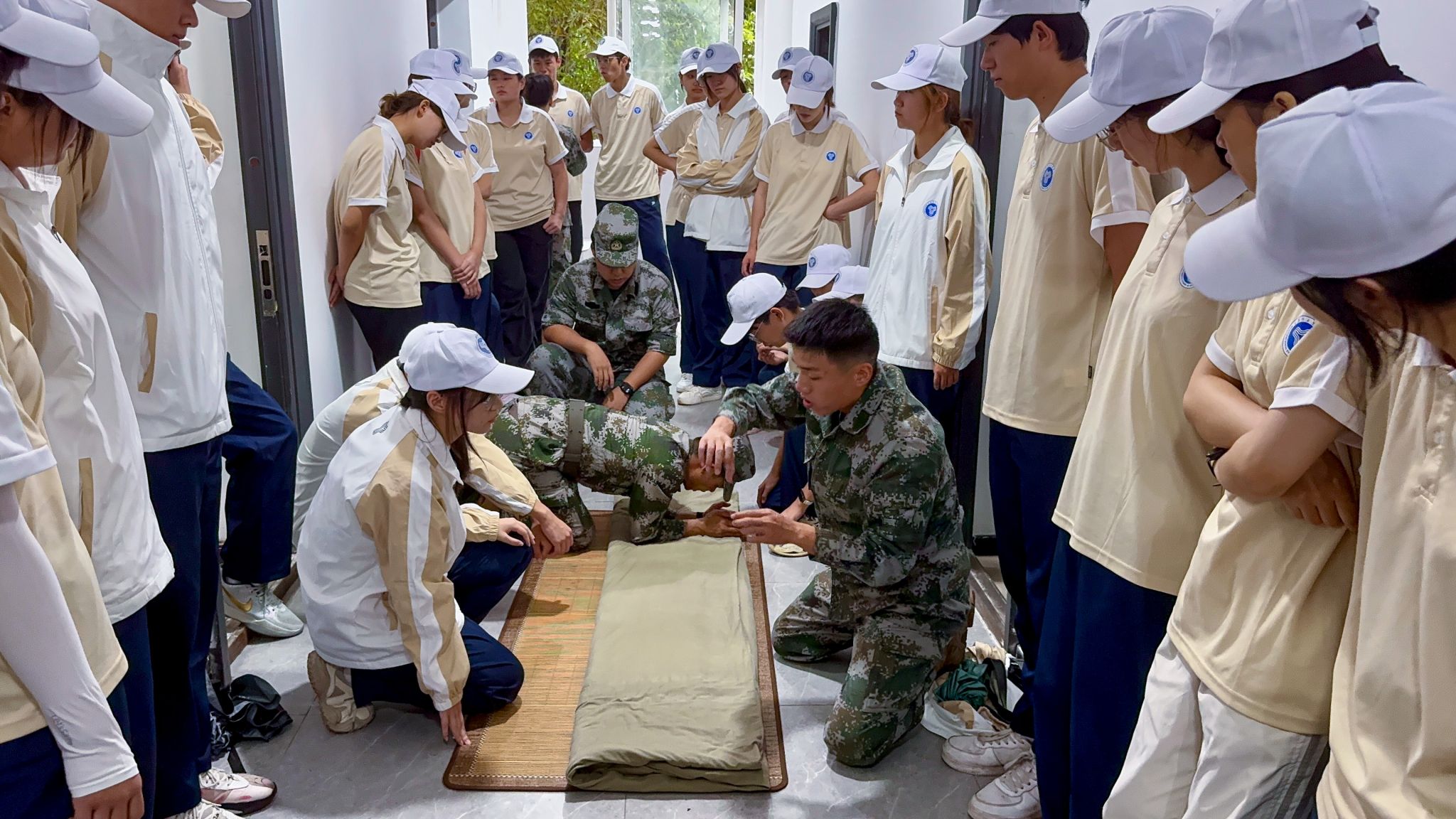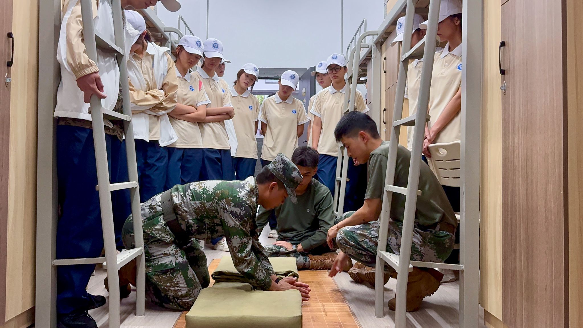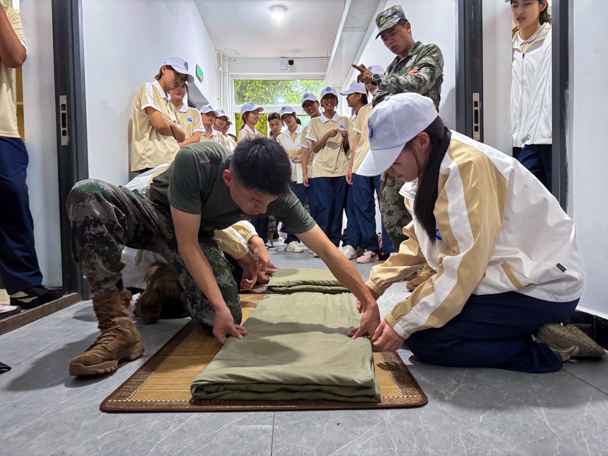 以训促习,养成自律生活态度。9月22日,同学们走进教官宿舍,参观标兵寝室。在一尘不染的地面、一丝不苟的床铺前,学生们深刻体会到“标准”的意义。教官现场演示叠被子时,手法娴熟,折叠利落,四角分明,同学们则争相上手体验,有的因折痕不直而皱眉,有的因叠出方正被角而笑颜绽放。书院学生发展导师指出,养成良好的生活习惯,是大学生自我管理的重要一步。希望同学们能把军训中养成的好习惯延续到今后的学习和生活中。