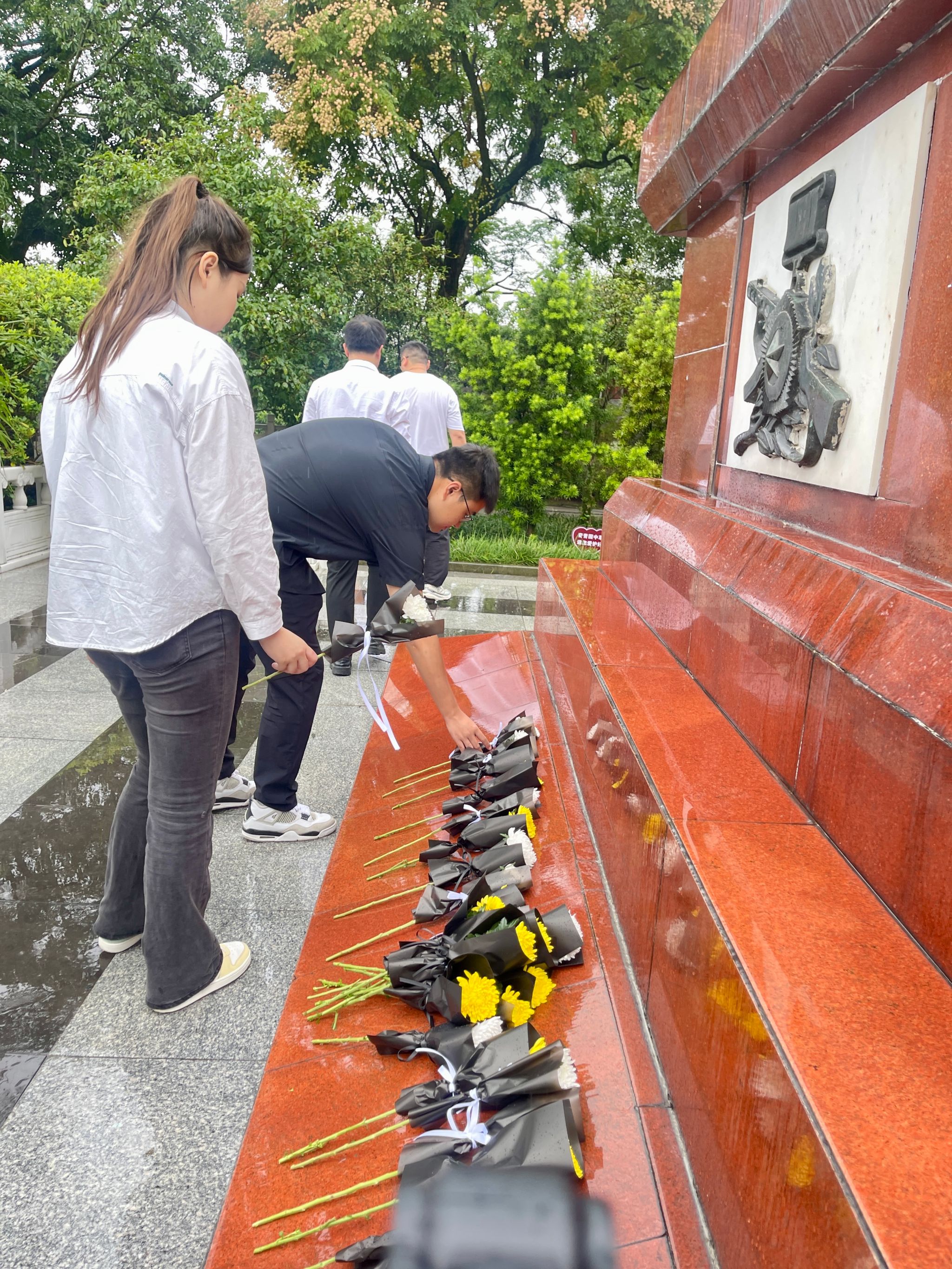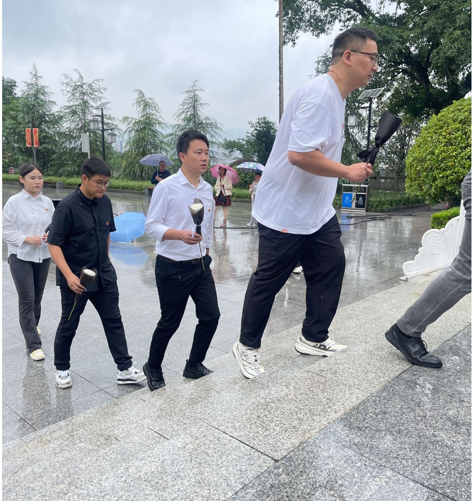 上午9时,烈士塑像前的广场上,雨水顺着塑像的肩头滑落,宛如先烈未曾冷却的赤诚。全体党员敛容肃立,党员同志们缓步上前,将盛满敬意鲜花献于塑像基座前。30秒的默哀时长里,唯有雨声淅沥,仿佛在与党员们一同追忆那段烽火岁月。