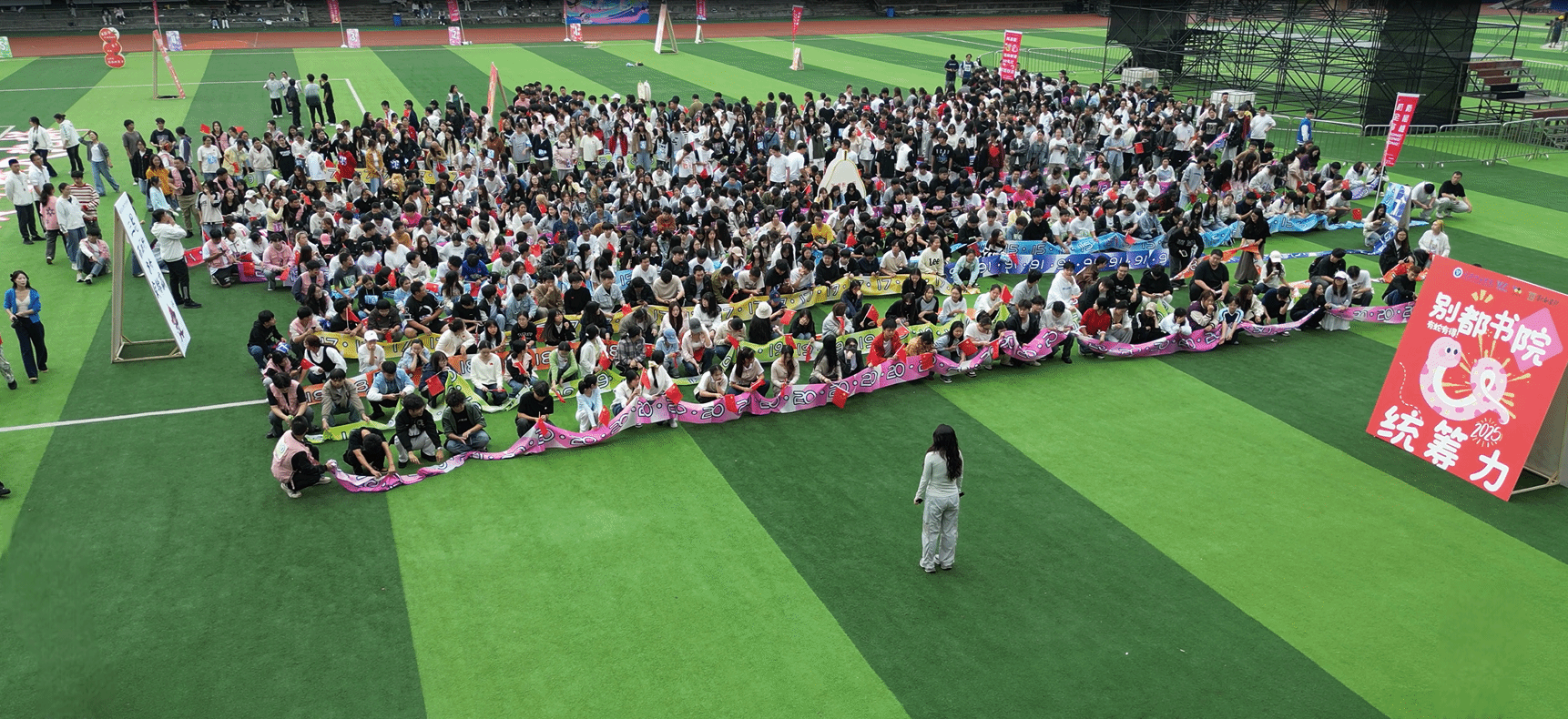 “我们玩的不是只是游戏,是能力的提升!”这正是本次活动的核心宗旨。别都书院与竞技体育中心通过“真人贪吃蛇”这一创新载体,成功地让“统筹力”这一抽象素养变得可感知、可训练、可提升,同时也让体育运动超越了单纯的强身健体,成为培养统筹思维与体育精神的综合舞台。活动现场,除了紧张刺激的挑战,还有令人动容的一幕。巨幅国旗在千人共擎下猎猎飘扬,青年学子们以《歌唱祖国》的嘹亮歌声向祖国深情告白。那一刻,青春的脸庞上写满了坚定与自豪,嘹亮的歌声中饱含着对祖国的无限热爱。这不仅仅是一场简单的创新活动,更是移通学子们将家国情怀内化于心、外化于行的生动体现。