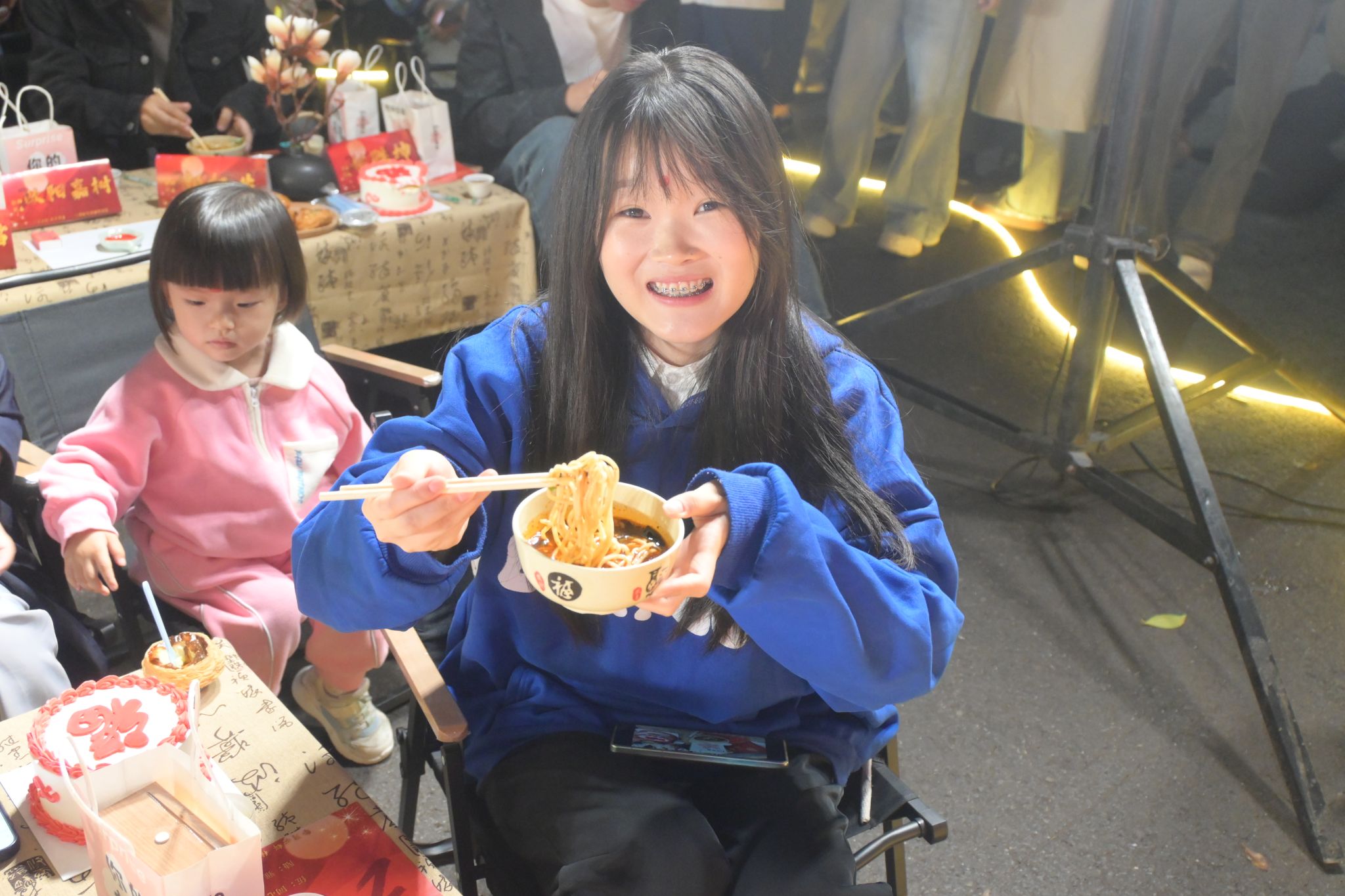 庆典的高潮在“同心庆生”环节如期而至。古意盎然的“三献礼”依序呈现:“初献寿桃,祈愿喜乐安康”;“亚献寿面,寓意福气绵长”;“三献福茶,致敬岁月情深”。三献礼成,福泽共享。随后,所有寿星移步台前,拍摄下“全家福”,定格这难忘的瞬间。在摇曳的烛光与全场合唱的生日歌声中,寿星们许下美好愿望,并共品长寿面,同祈安康。