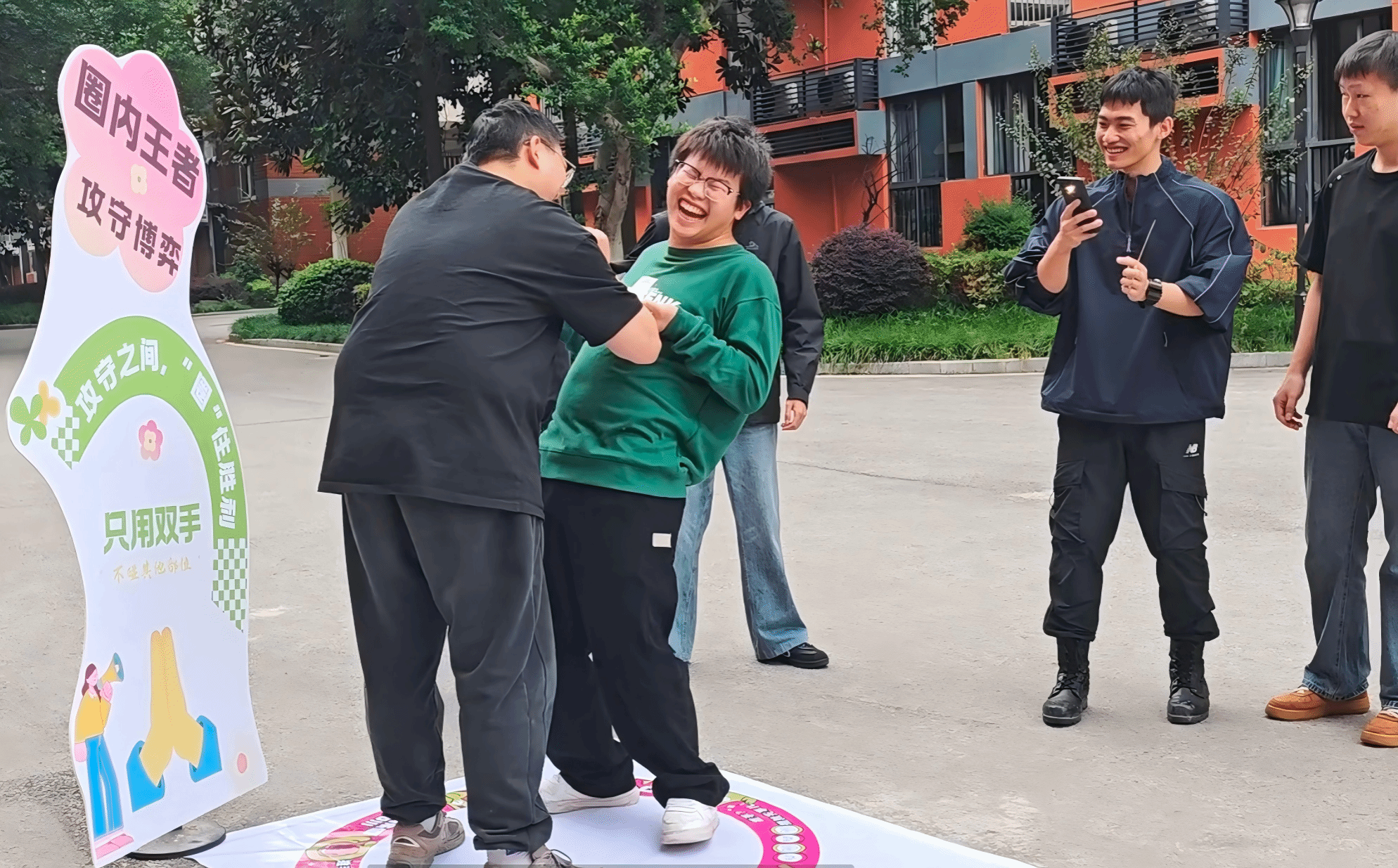 “圈内王者·攻守博弈”则更显智慧与巧劲。圈内狭路相逢,参与者以双手为“武器”,在遵守规则的前提下展开心理与技巧的博弈,闪转腾挪间尽显青春灵动。这些精心设计的项目,无一不体现着别都书院在提升学生身体素质的同时,对学生心理素质、创新思维和规则意识培养的细致考量。