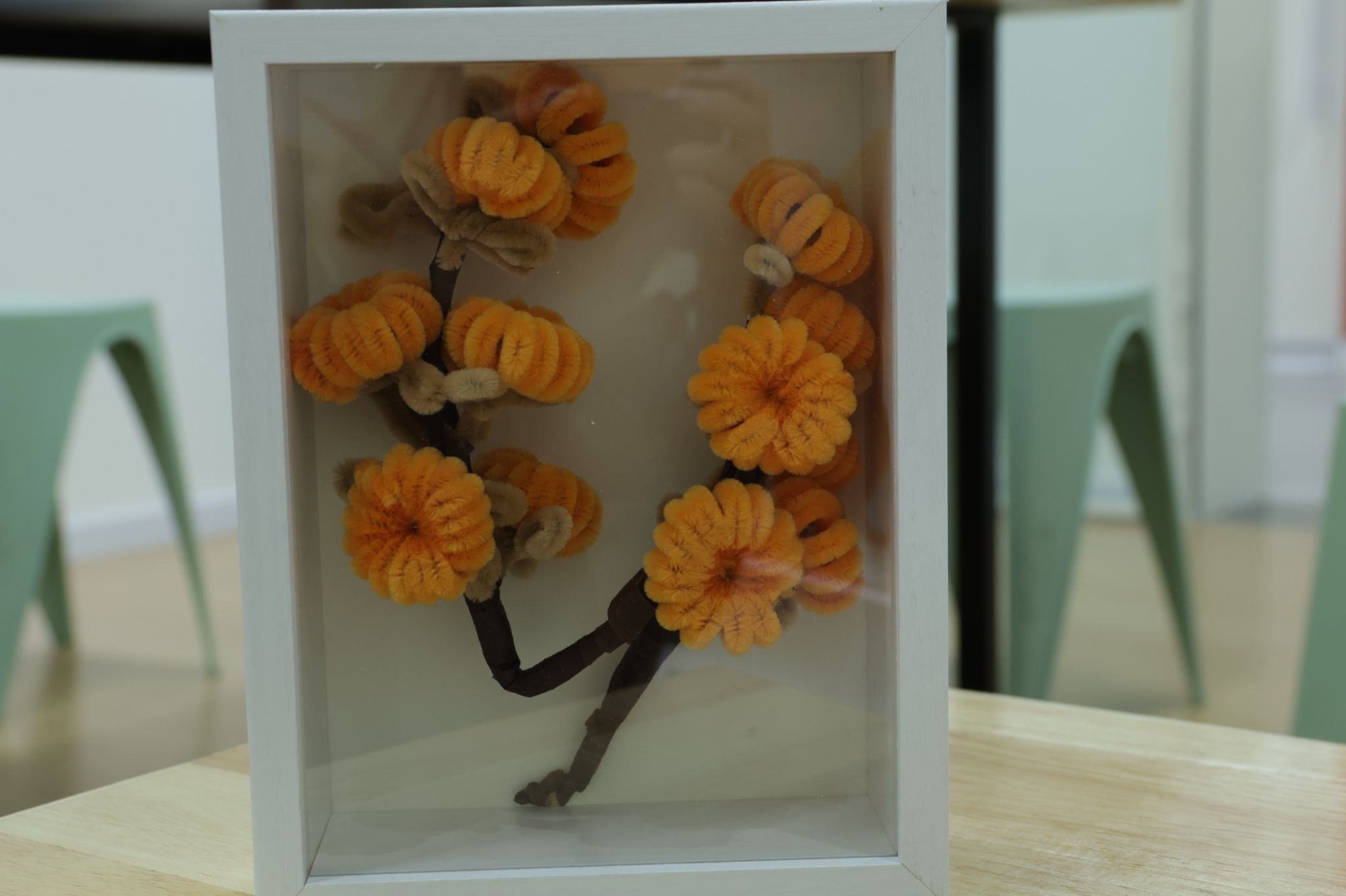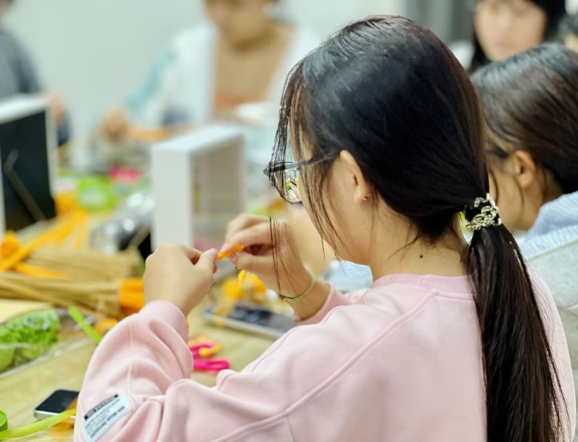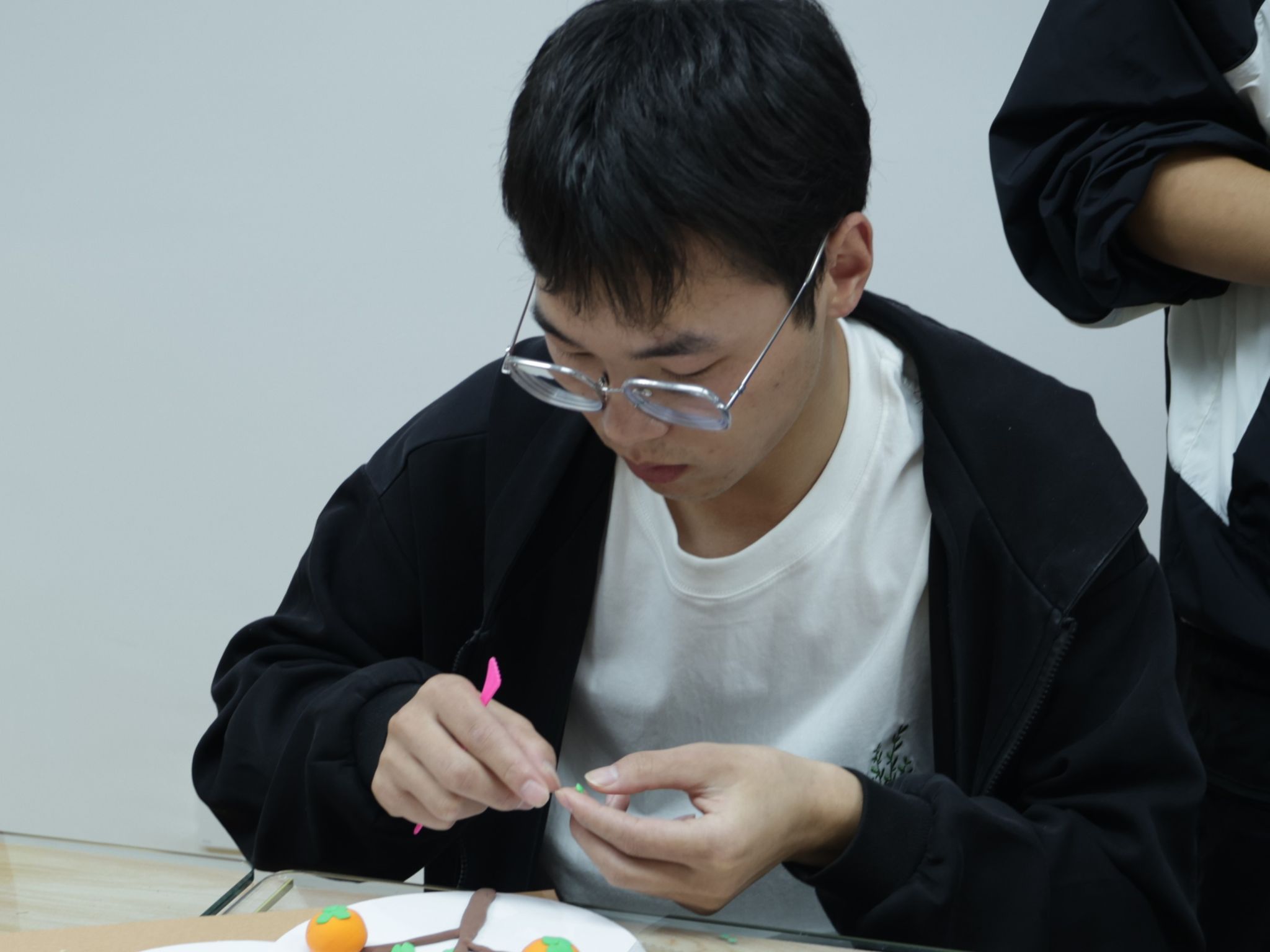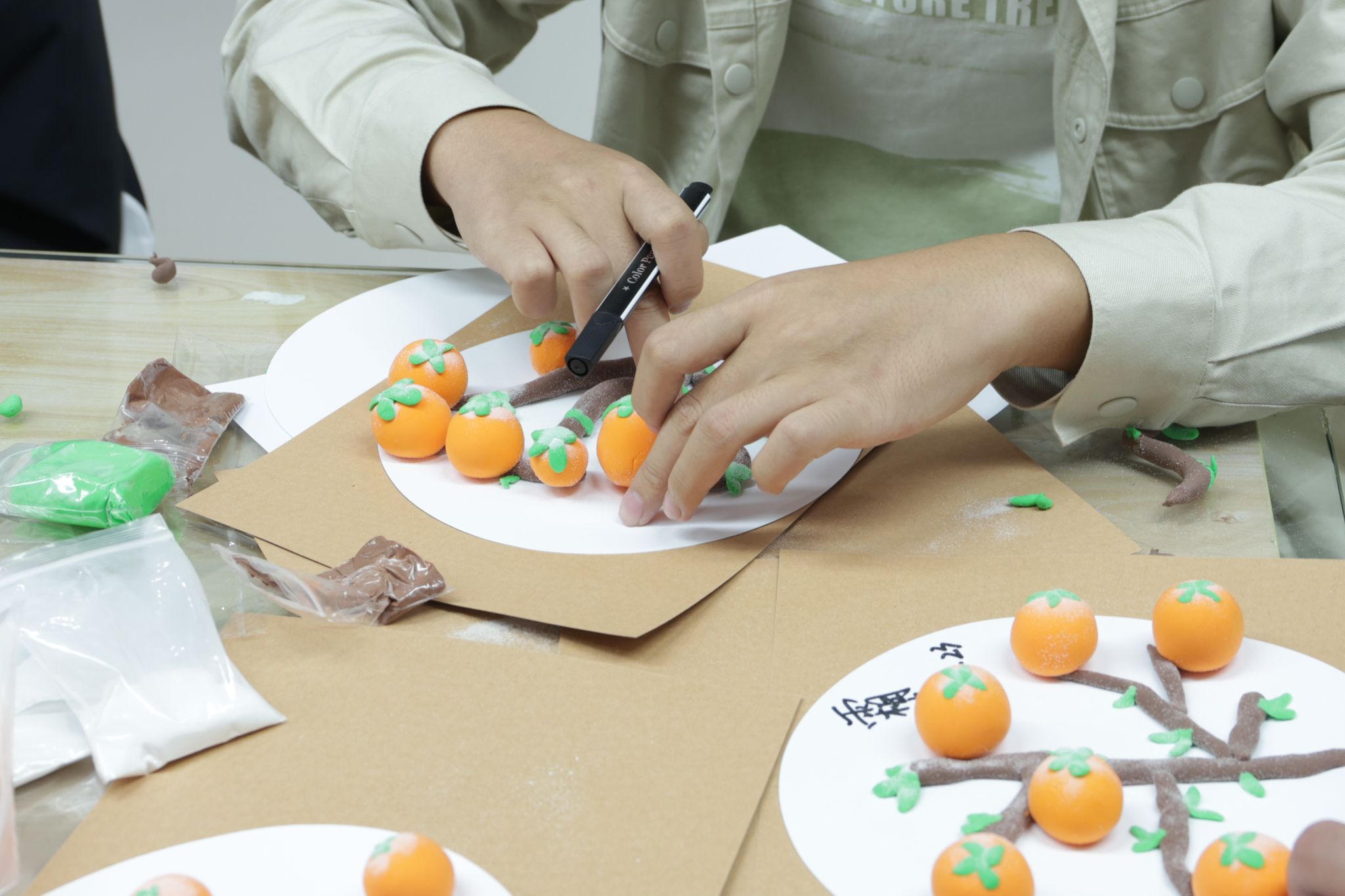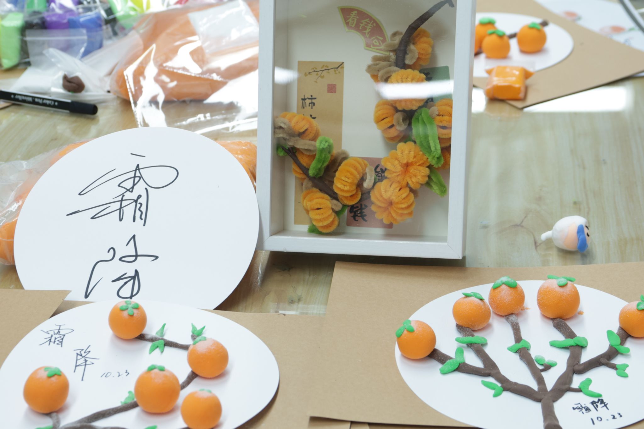 彩色的黏土经过揉、捏、塑、点,也化作一颗颗饱满软萌的柿果。这些作品被嵌入画框,定格的是“柿柿如意”的美好祝福,也是此刻满室的专注与温情。