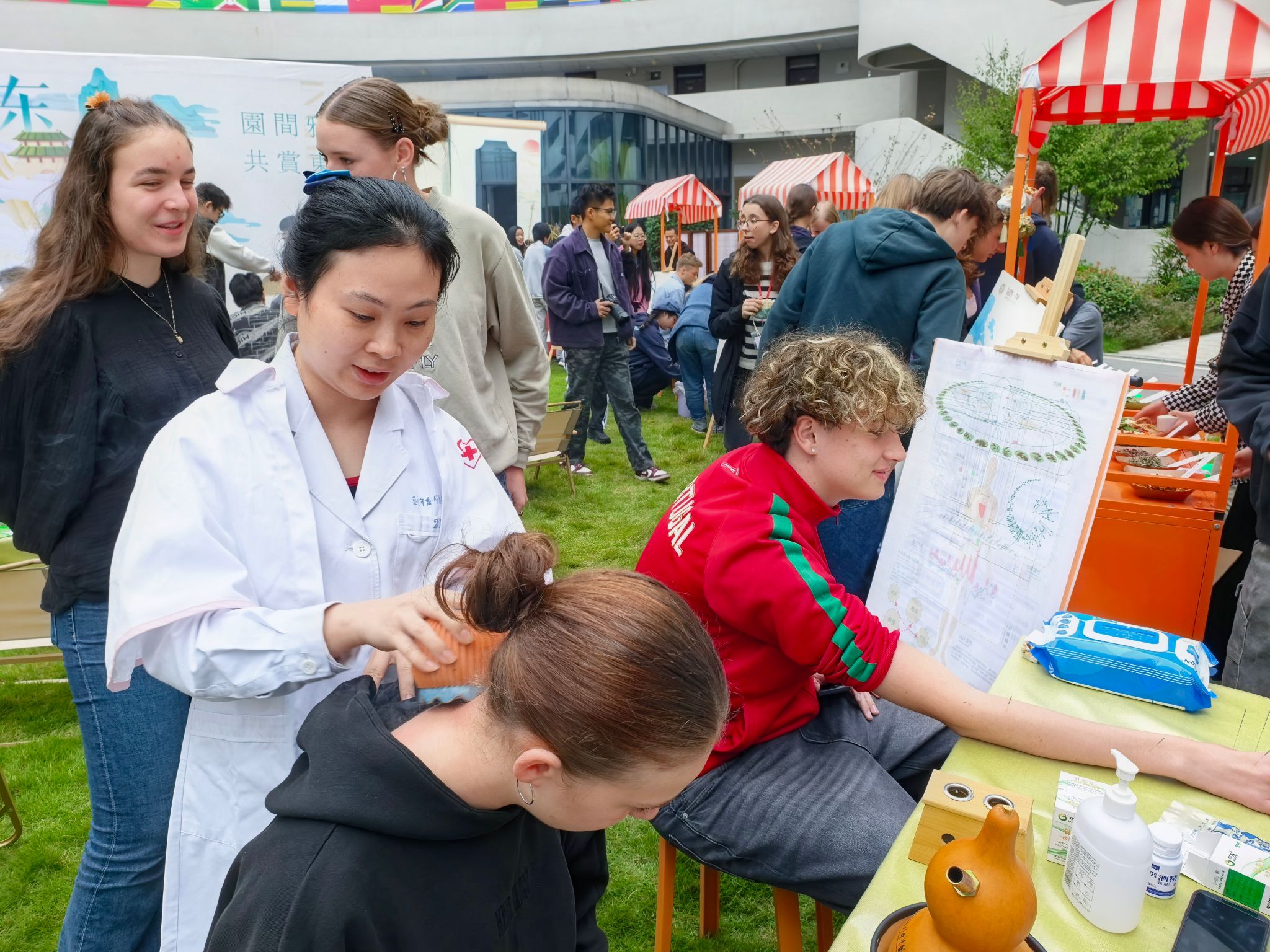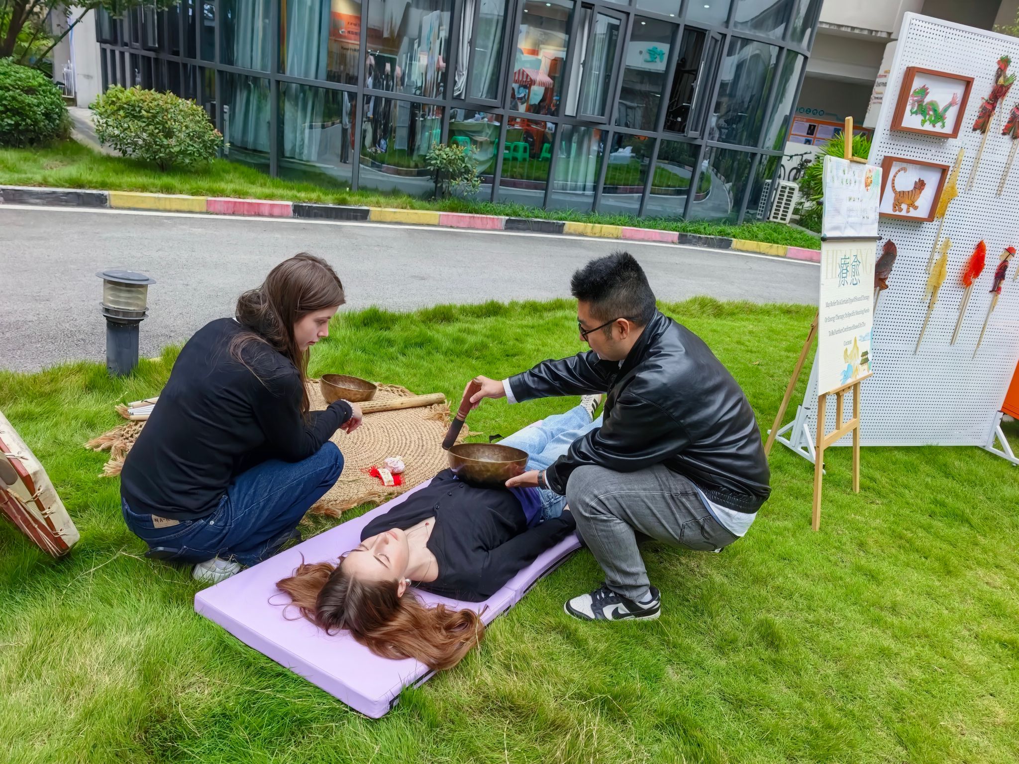 在东方解压体验环节,速度被放缓,感官被唤醒,源自东方的古老智慧,正以它独特的“松弛感”温柔地拥抱每一位远道而来的客人。颂钵疗愈区仿佛一个与世隔绝的音场。当黄铜钵棒轻擦碗沿,低沉而悠远的嗡鸣如潮水般漫过整个空间。德国学生们平躺在软垫上,紧闭双眼,任由声波轻柔地按摩着每一寸神经。中医推拿角则上演着东西方关于身体的对话。合川区中医院的专业推拿师的手掌在肩颈穴位间游走,精准化解着长途飞行的疲惫与久坐的僵硬。