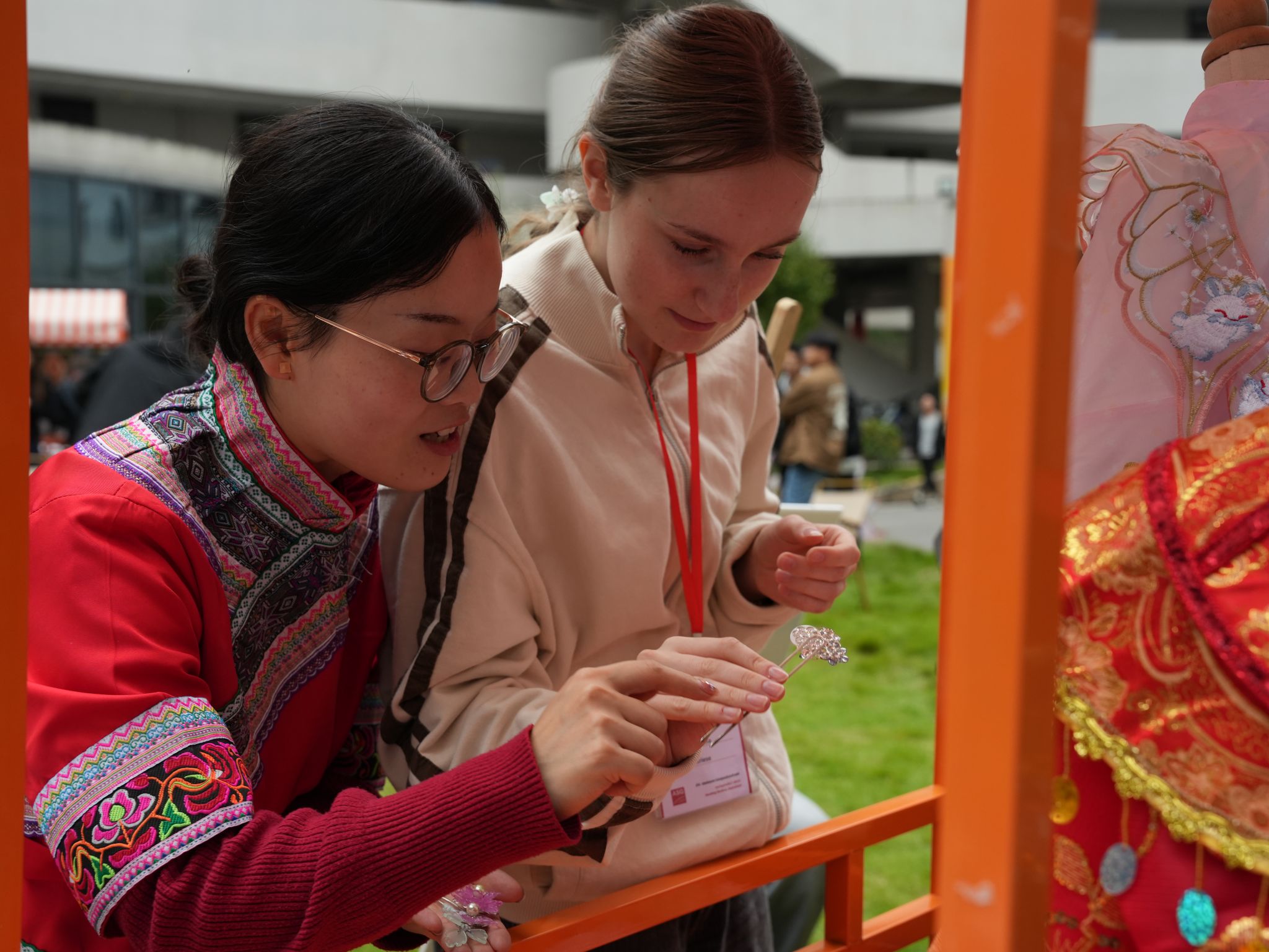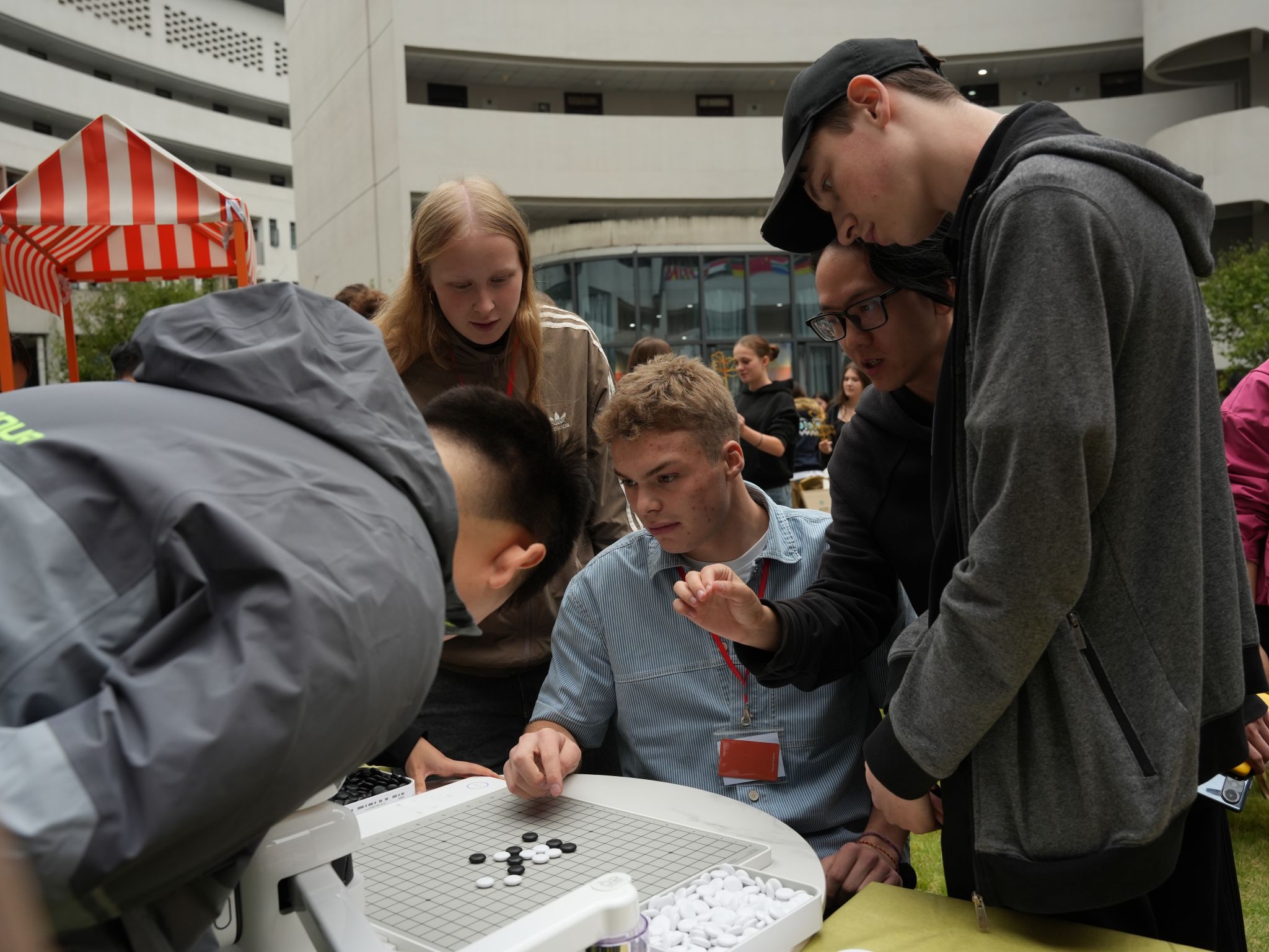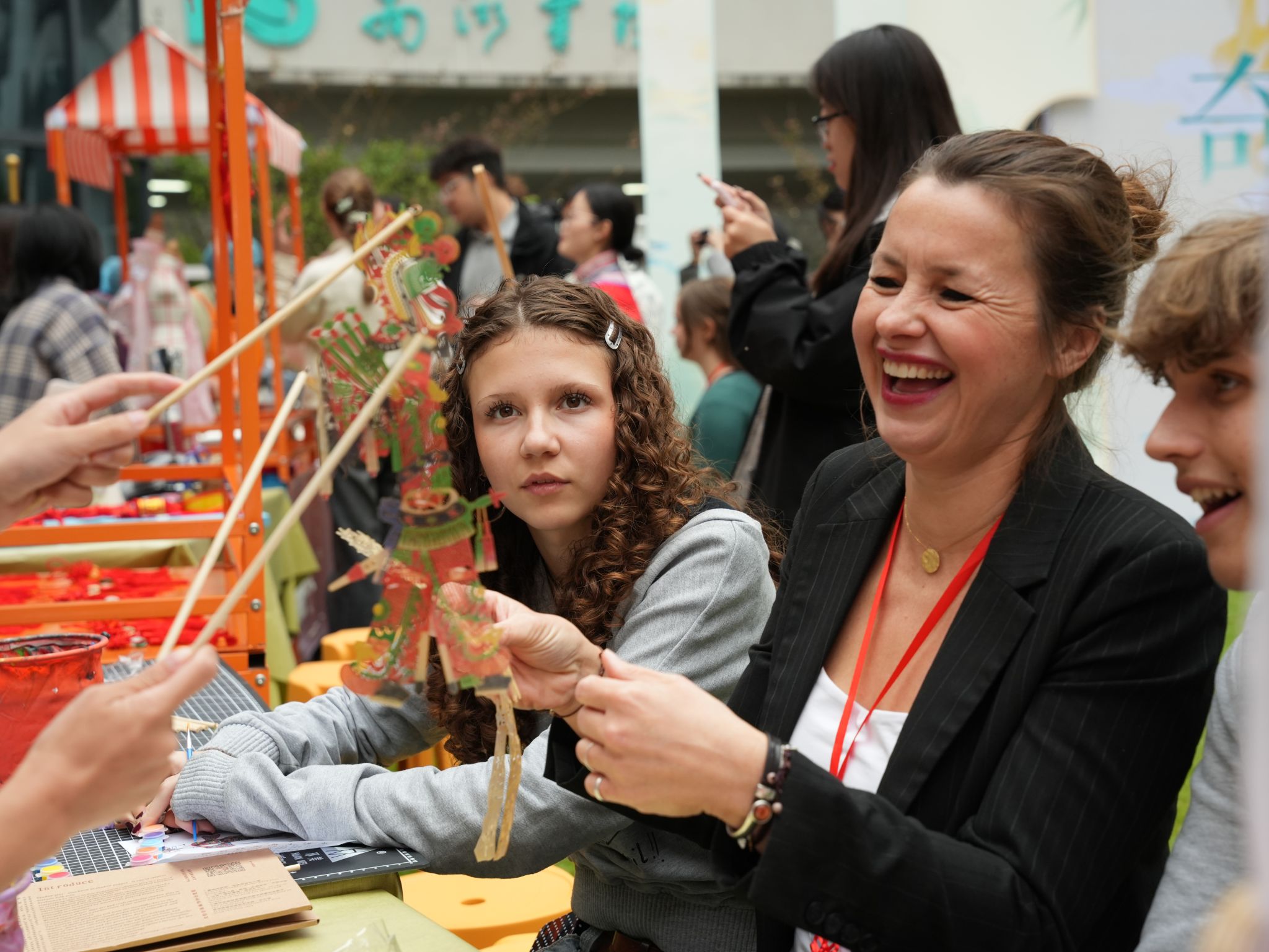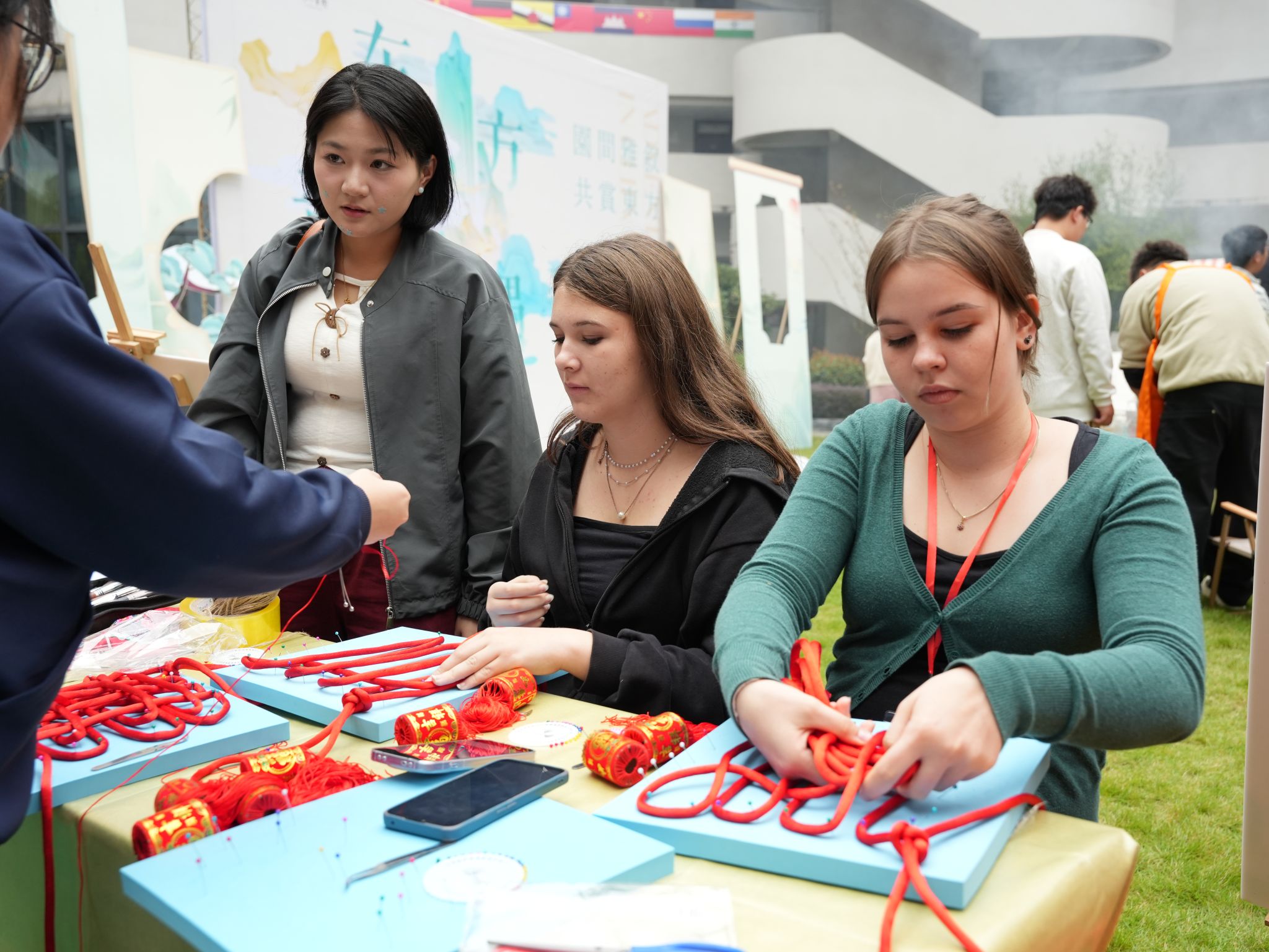 文化沉浸体验则成了最热闹的环节,雕版印刷台前,中外学生携手拓印出墨色诗文,纸张上的纹路里藏着共同的创作欣喜;汉服体验角中,不同肤色的身影穿梭在汉元素的罗裙广袖间,试穿者对着镜子整理衣襟,讲解者笑着科普“交领右衽”的礼仪;刀锋在牛皮上游走的皮影文化区里,中外学子共同雕刻出皮影角色的轮廓,当灯光亮起,白幕上跳跃的身影便成了他们共同谱写的东方童话;中国结编织区,丝线在指间翻飞勾勒出绵长祝福,将一根红绳的哲学——“以简驭繁,贯穿始终”悄然领悟;AI围棋擂台,黑白云子落在棋盘清脆作响,古典智慧与现代科技在此交锋;漆扇创作台,大漆在金箔基底上自由流淌,每一把旋转而成的扇面都是“天人合一”的偶然之美;中药荷包角,艾草与薄荷的清香弥漫课堂,大家小心翼翼地将药材装入锦囊,把“上工治未病”的东方养生智慧,化作一枚可随身携带的温柔守护。