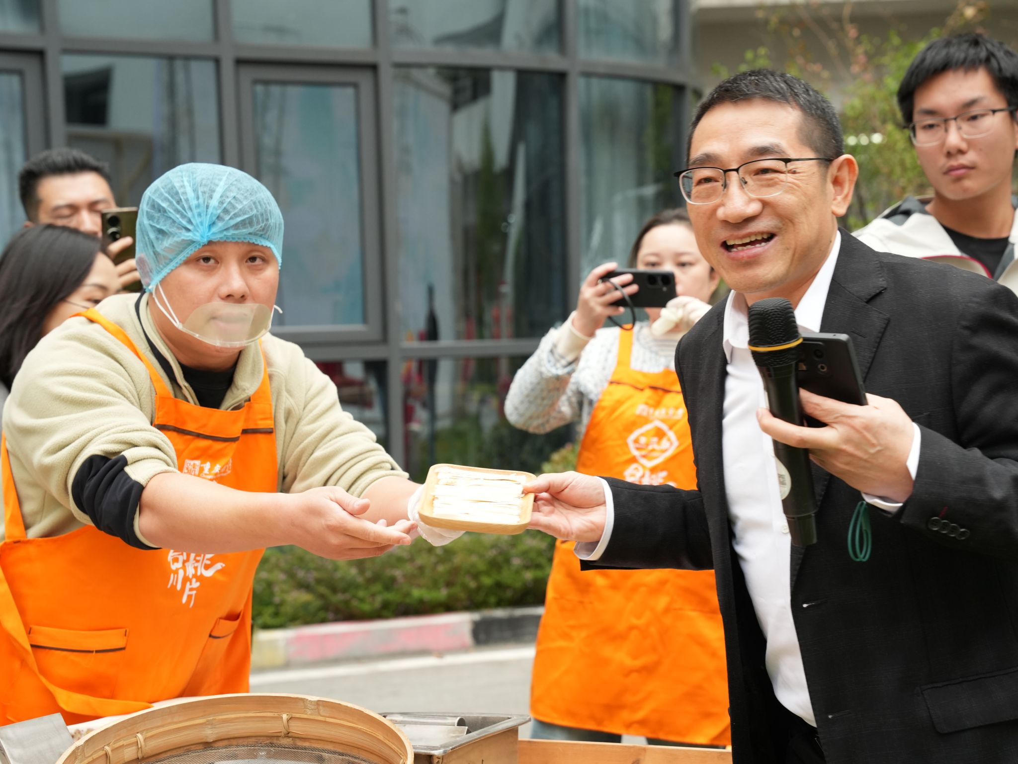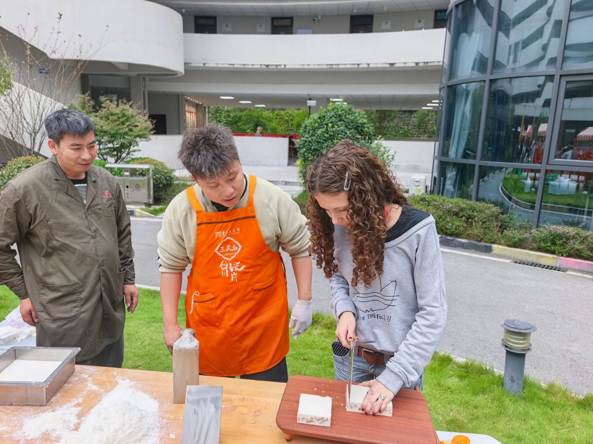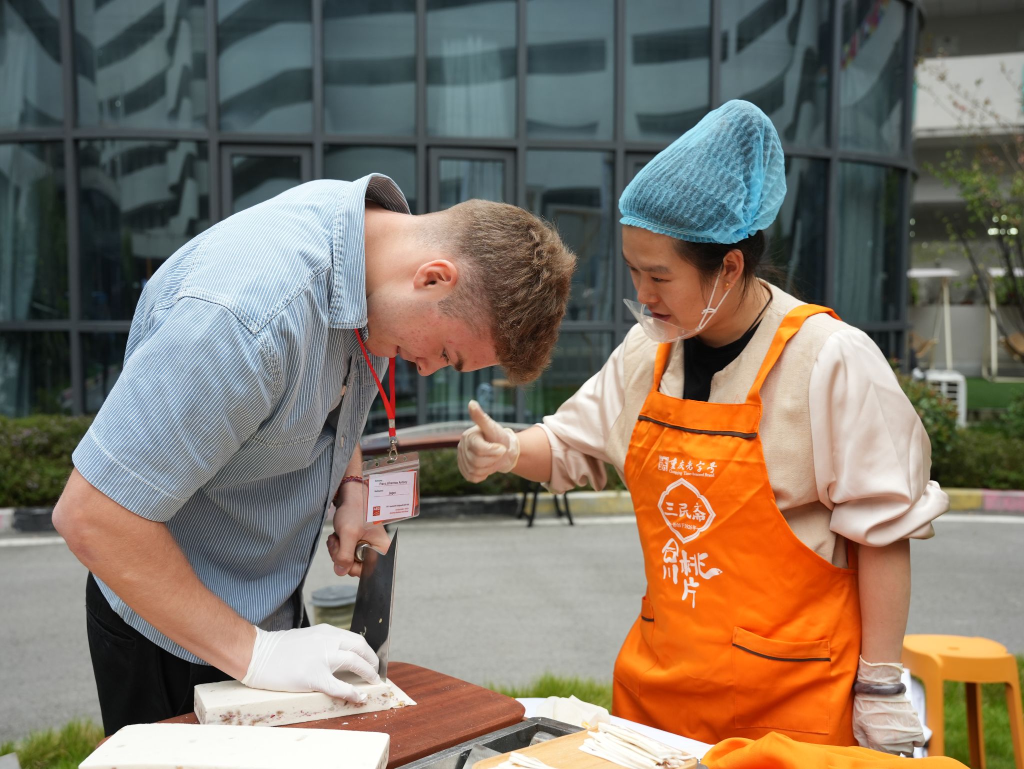 随着南湖书院名誉院长莫光华教授对合川桃片文化的德文介绍,留学生的目光被合川非遗美食所吸引。合川“三民斋”桃片木桌案板上弥漫着糯米与核桃的暖香。游学团师生看着非遗匠人李师傅刀起刀落,薄如蝉翼的米片如雪花般叠起,连连惊叹:“这真是食物吗?更像是东方丝绸!”当清甜在唇齿间化开,混合着琥珀核桃仁的酥香,德国师生频频点头并体验了合川桃片的手工技艺,为自己亲手制作了一份独特的合川桃片。”