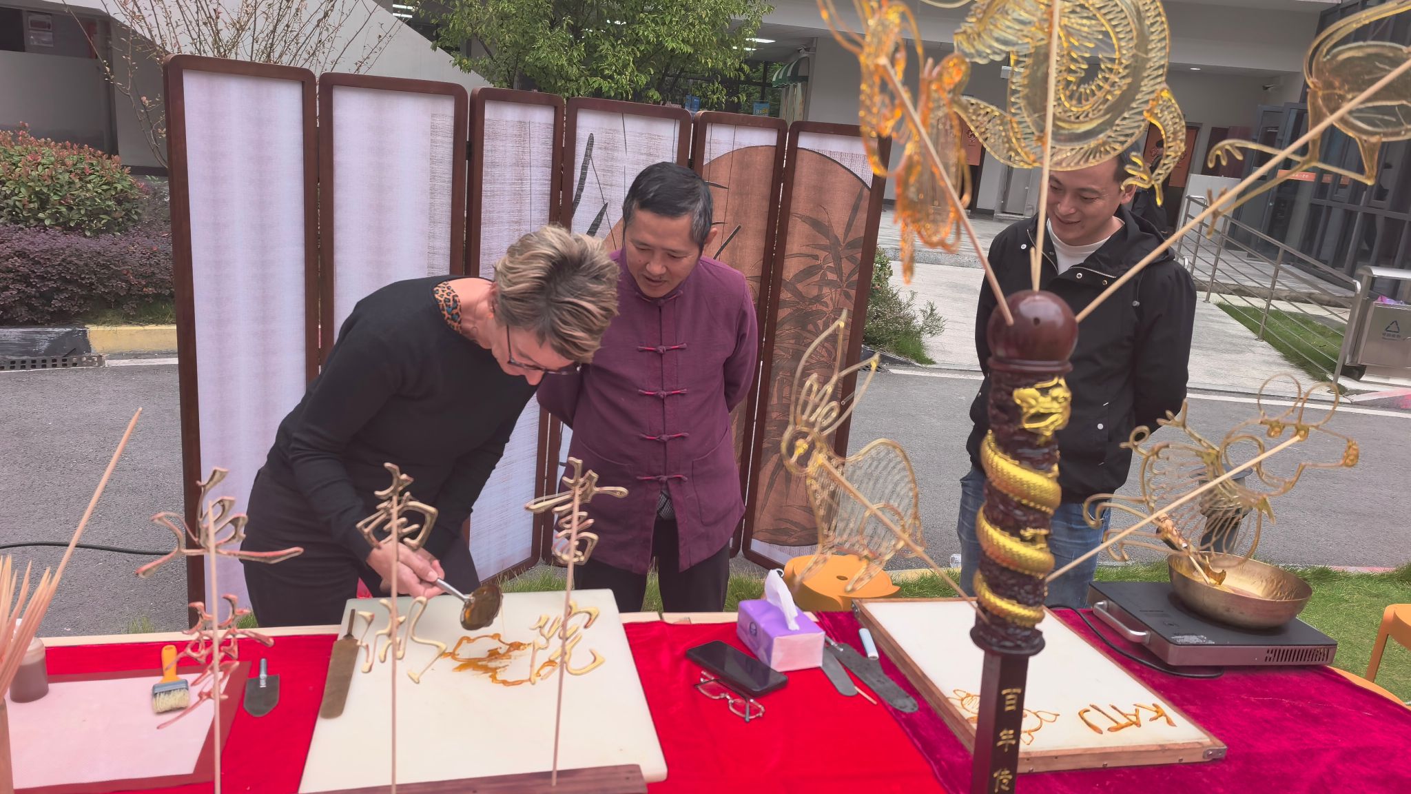 合川非遗糖画匠人徐师傅以铜勺为笔,糖液为墨,手腕轻转,金黄的糖浆便如丝如缕地倾泻在光洁的大理石板上。转瞬之间,展翅的飞凤、腾云的蛟龙便活灵活现地凝于盘上,引来一片压低惊呼的“Wunderbar!”留学生们轮流坐上“大师位”,屏息凝神地尝试驾驭那流动的“甜蜜”,每一个独一无二的作品,都成了他们理解这门瞬时艺术的珍贵印记。