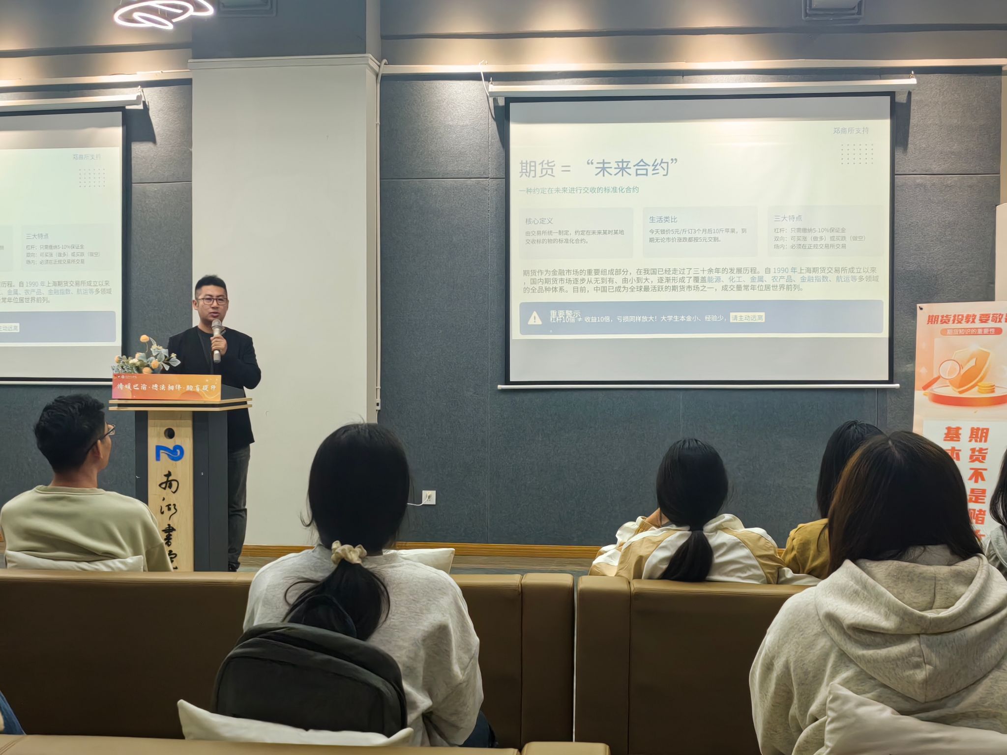 为深化校园法治教育、筑牢校园安全屏障,本次活动还邀请中信建投期货投教基地刘帅康与鱼城书院综合办公室主任金鑫老师共同围绕期货知识、防范非法金融、反洗钱等主题在开展讲座,用通俗语言解读专业法规,帮助学生清晰识别金融骗局、掌握避险方法,切实提升金融法治意识与风险防范能力。