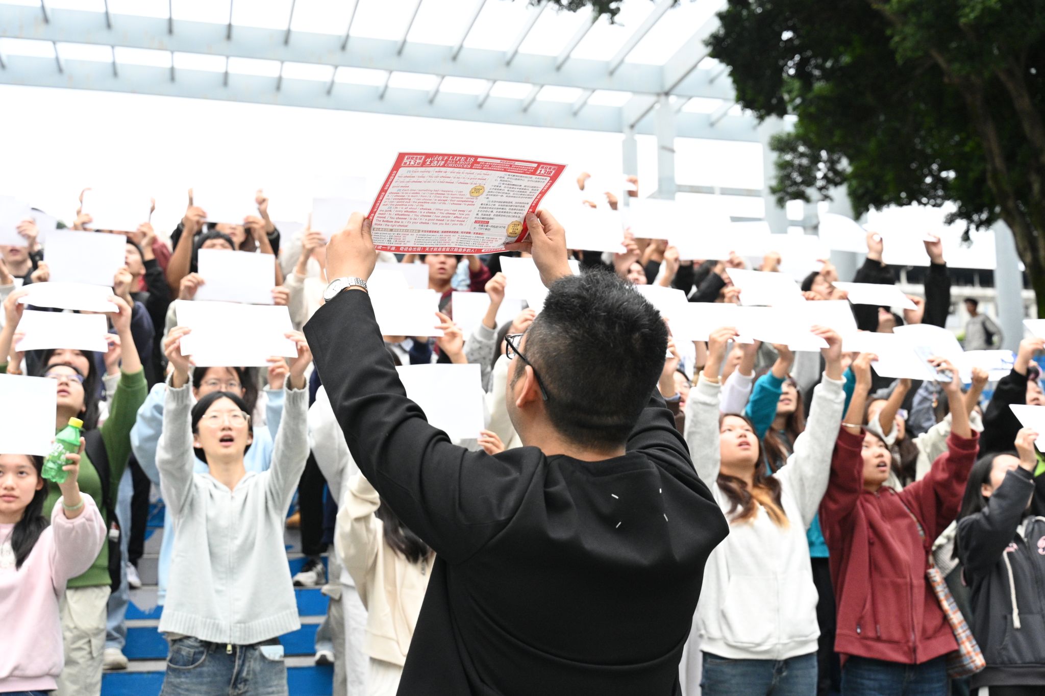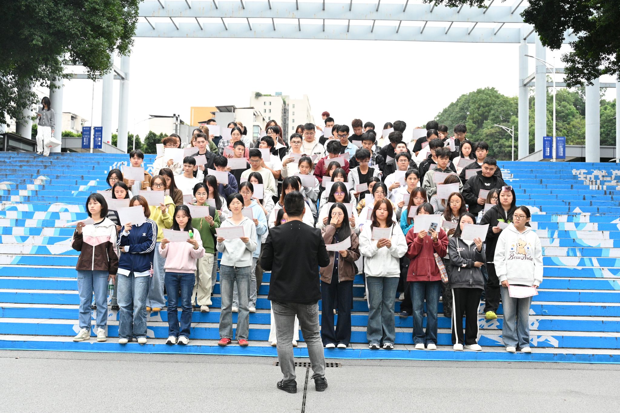 黄桷树广场诵读区,双院紧扣学生英语四六级备考需求,打造书院教师引领集体诵读的学风建设场景。在鱼城书院综合办公室主任金鑫老师带领下,上百名学生齐声朗读高分作文模板,将听觉记忆与开口实践结合,强化核心语法与重难点词汇记忆。金老师现场进行语法分析,将学风建设从教室延伸至广场,打破课堂学习与社区生活的壁垒。除此之外,他还将正念冥想融入本次集体诵读,以“LIFE IS ALL ABOUT CHIOICES”为题,鼓励同学们时刻觉察自己的情绪,永远选择更好的一面,积极成为更好的自己。来自通信与信息工程学院、南湖书院的学生陶晋徽表示:“集体诵读很有氛围感,难记的句型跟着读几遍就记住了,比自己埋头背效率高多了。”