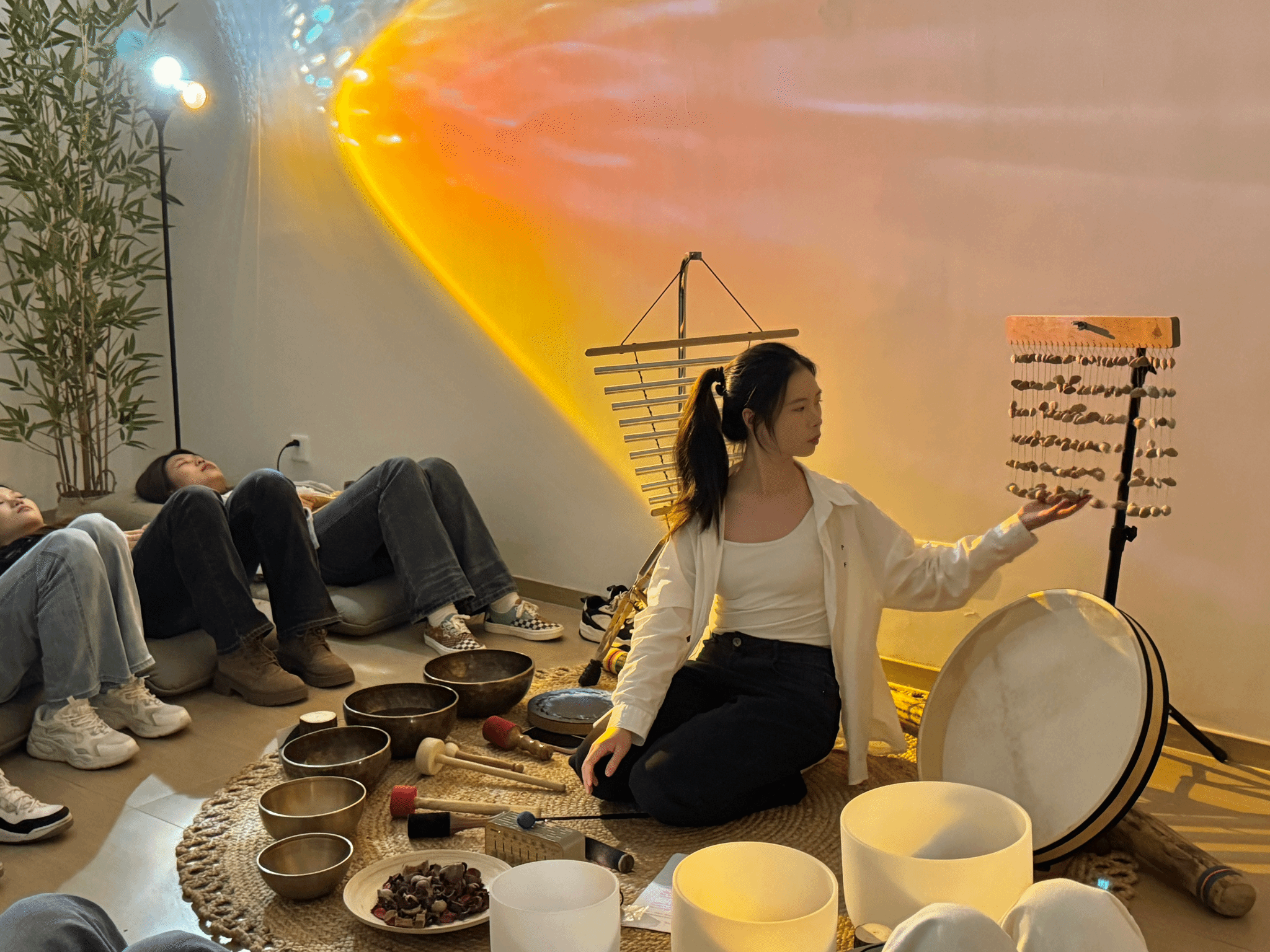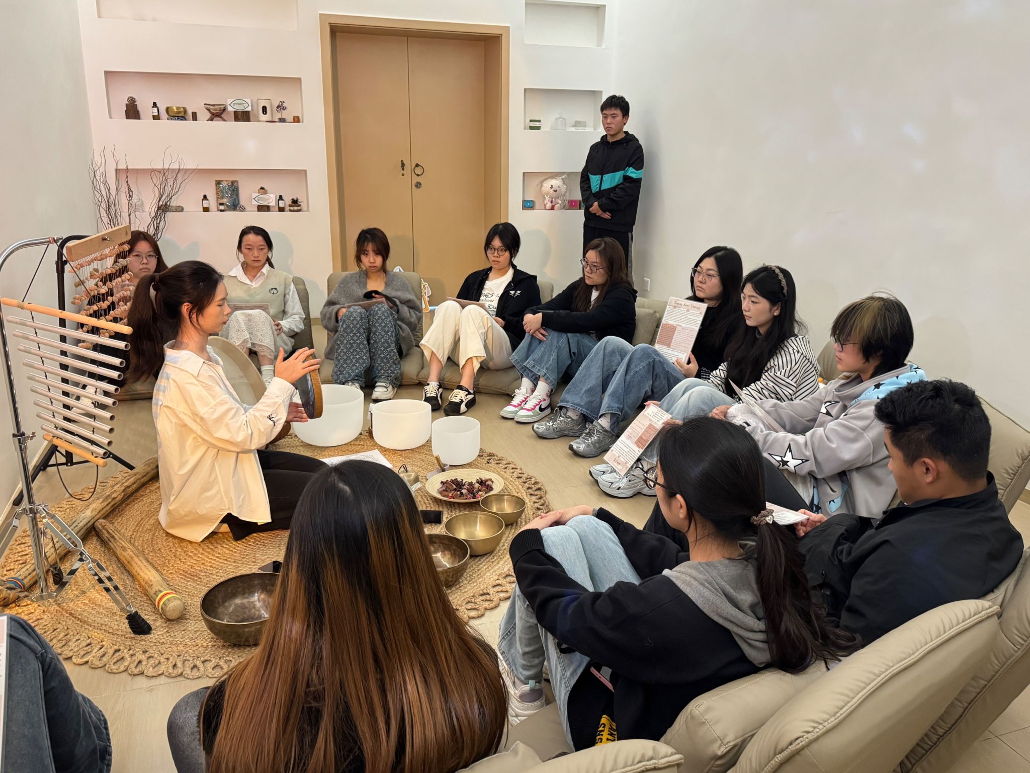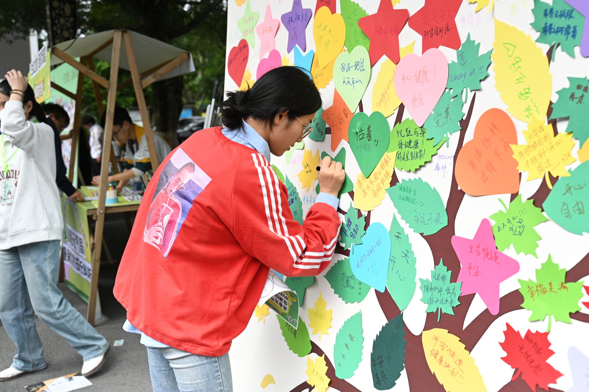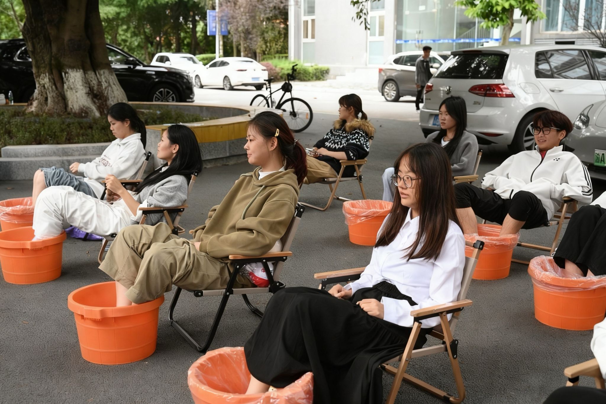 “感知生命价值,筑牢健康根基”的情景式生命教育理念在校园内生动传递。师生或写下成长感悟,或绘画纾解烦恼,共同拼贴出枝繁叶茂的集体生命树,让生命教育可视化。烟害警示展通过解剖式插画直观呈现吸烟对肺部、心脏的损害,强化师生对烟草危害的清晰认知与主动规避的健康防护意识。足愈暖疗点位上,师生在花椒、生姜等原料泡脚中舒缓压力,驱散久坐或奔走的身体乏累。申时茶叙时,师生围坐品茗,在传统养生文化中感受身心放松。颂钵疗愈音乐会上,学生疗愈师主导的颂钵疗愈帮助师生卸下平日的紧绷,实现生理心理双重健康守护。