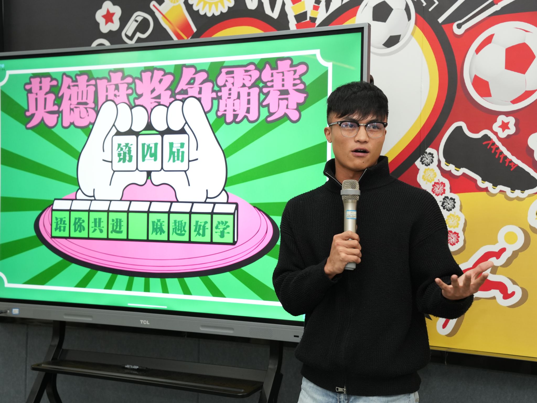 接着,南湖书院综合办公室主任齐旭老师为大家介绍了英德麻将的设计初衷和赛制规则。她提到:“希望同学们在英德麻将桌上用英语或德语完成‘吃’‘碰’‘胡’等环节,并通过字母牌组合单词、构建句子,在真实语境中锻炼语言组织与应变能力。真正实现了外语学习的‘被动接受’到‘主动建构’的转变。”