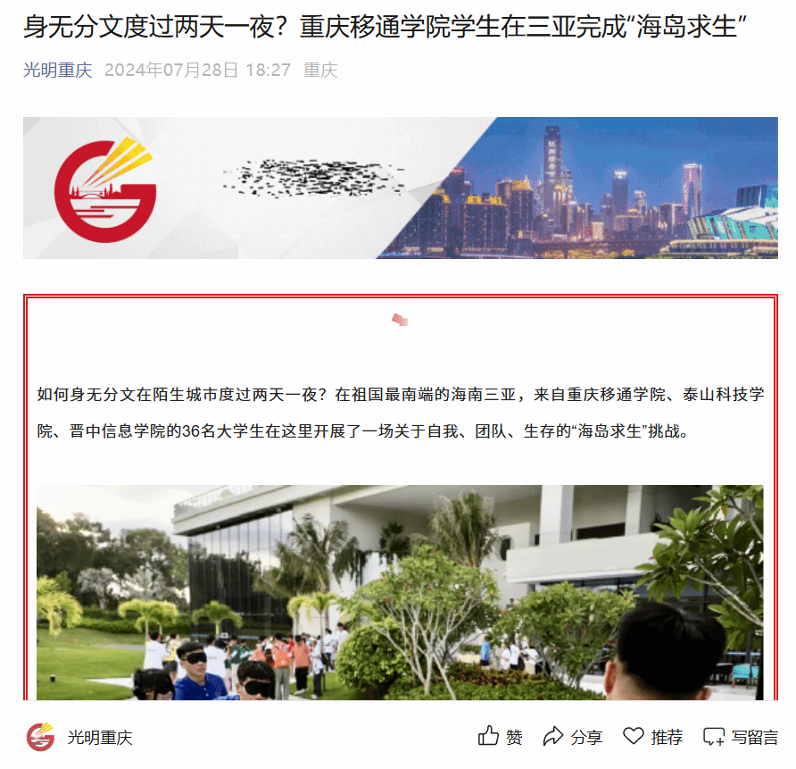 网易新闻:身无分文度过两天一夜?重庆移通学院学生在三亚完成“海岛求生”