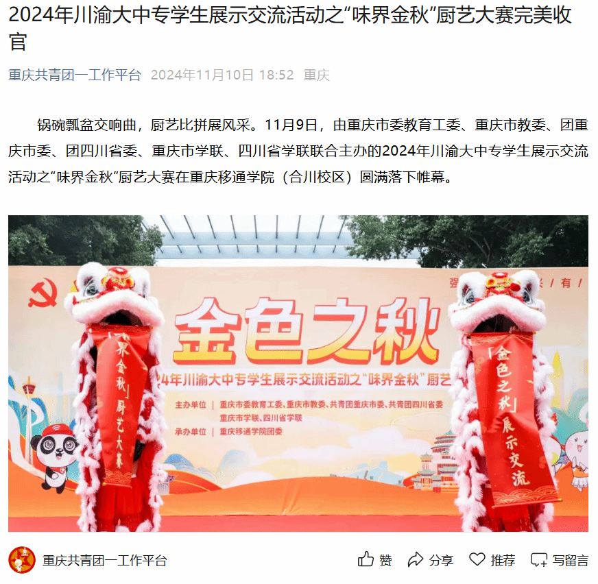 重庆共青团:2024年川渝大中专学生展示交流活动之“味界金秋”厨艺大赛完美收官