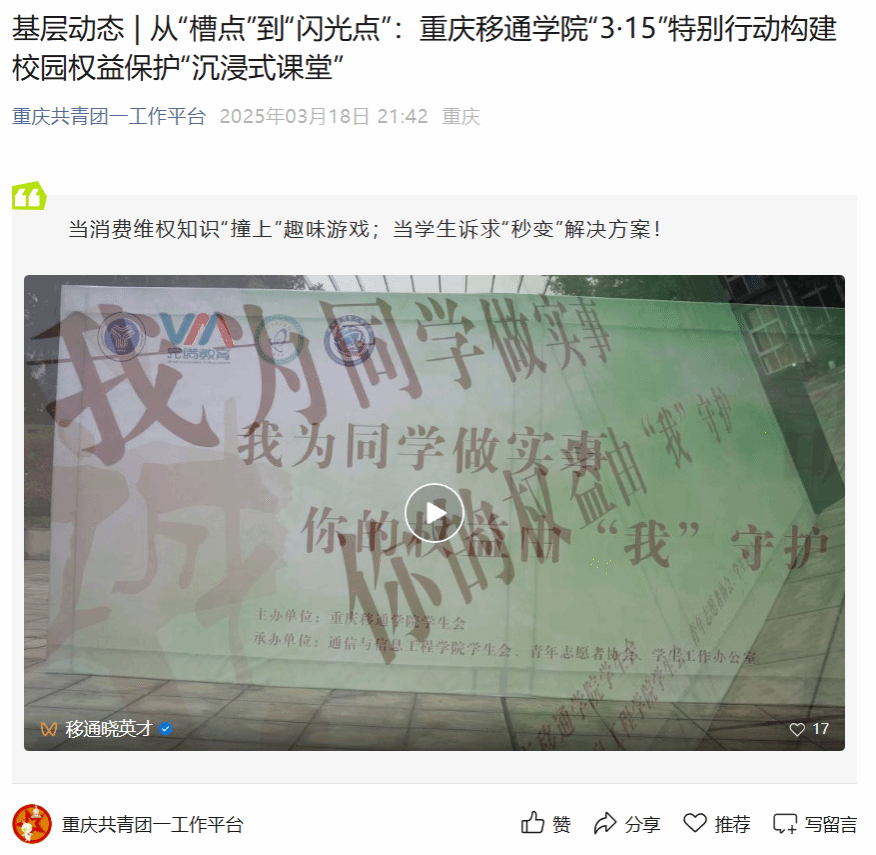重庆共青团:基层动态 | 从“槽点”到“闪光点”:重庆移通学院“3·15”特别行动构建校园权益保护“沉浸式课堂”