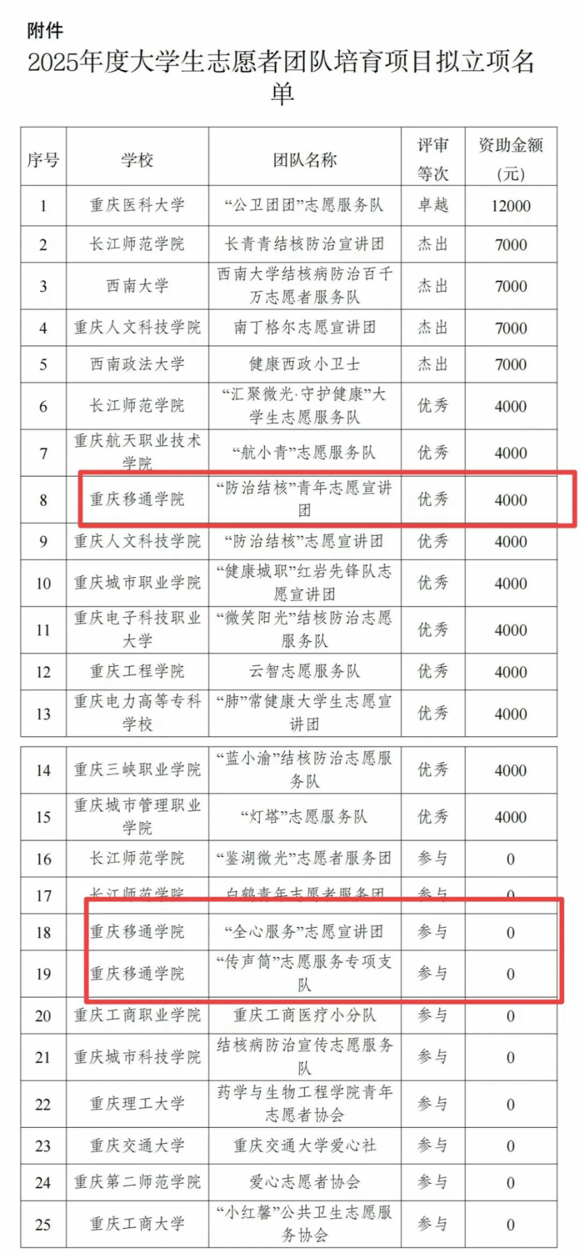 近日,重庆市结核病防治所正式公布了2025年度“大学生志愿者团队结核病防治知识传播活动培育项目”立项名单。我校“防治结核”青年志愿宣讲团、“全心服务”志愿宣讲团、“传声筒”志愿服务专项支队,成功入选该培育项目,其中“防治结核”青年志愿宣讲团培育项目被评审为“优秀”等次,并荣获4000元的资助金额!