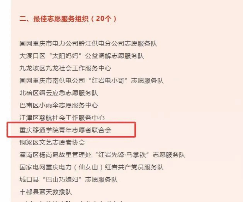 近日,中共重庆市委社会工作部公示了《2024年度志愿服务先进典型名单》,我校青年志愿者联合会凭借卓越表现荣获"重庆市最佳志愿服务组织"称号。