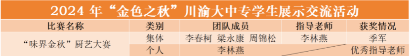 我校承办“味界金秋”厨艺大赛,联动川渝27所高校切磋厨艺,进行厨王争霸赛、美食社团展演,并荣获2024年“金色之秋”川渝大中专学生展示交流活动优秀组织奖。同时,并获得金紫山青年发展型街区规划设计大赛、“味界金秋”厨艺大赛、“青”绘钓鱼城川渝青年绘画比赛中荣获集体三等奖2项,优秀奖3项,季军1项和1名优秀指导老师的佳绩。