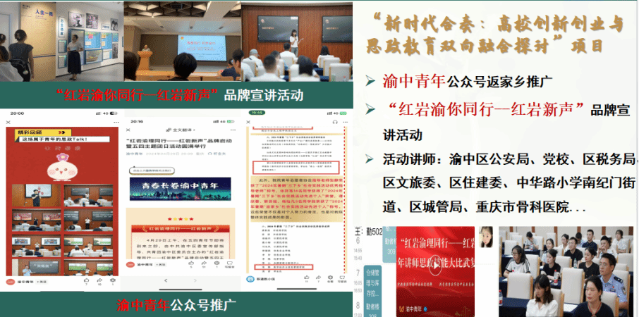在专业建设这条路我从未停止过步伐,“新时代合奏:高校创新创业与思政教育双向融合探讨”项目曾被重庆市渝中区共青团2024返家乡推广,旨在推动校企合作,对接产教融合。
