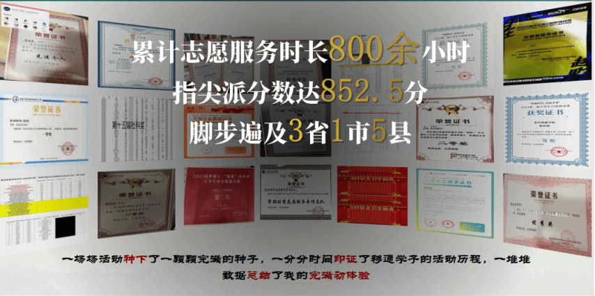 纵观大学两年,我于尝试中探索,于探索中创新,从綦江区第二届运动会到双校区“我与身边非遗故事”征文比赛,从全国大学生技术创新创业到大学生基本技能实践,从“科技逐梦,智引未来”科技节到讲解员的“校园家长开放日”活动,我的身影无处不在。如今,我志愿时长已达800h左右,指尖派分数达852.5分,一场场活动种下了一颗颗完满的种子,一分分时间印证了移通学子的活动历程,一堆堆数据总结了我的完满初体验。向下扎根,向上生长,这就是一位瑶字女孩的成长“竹”迹。