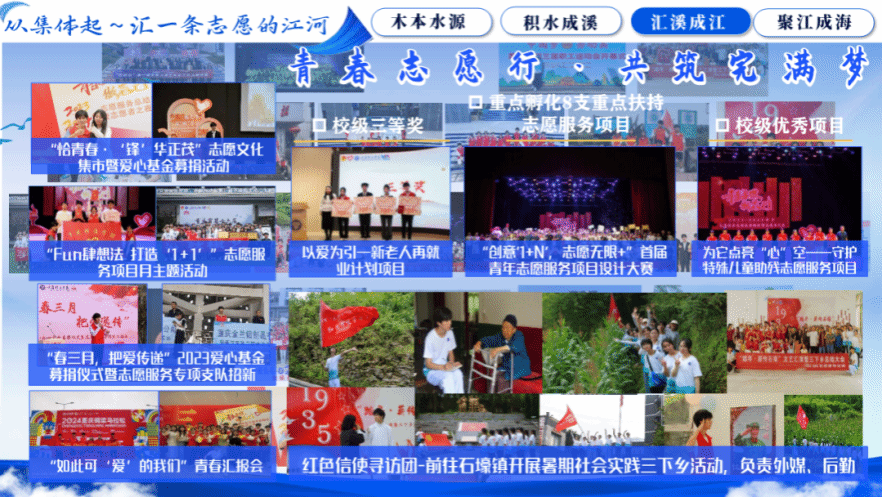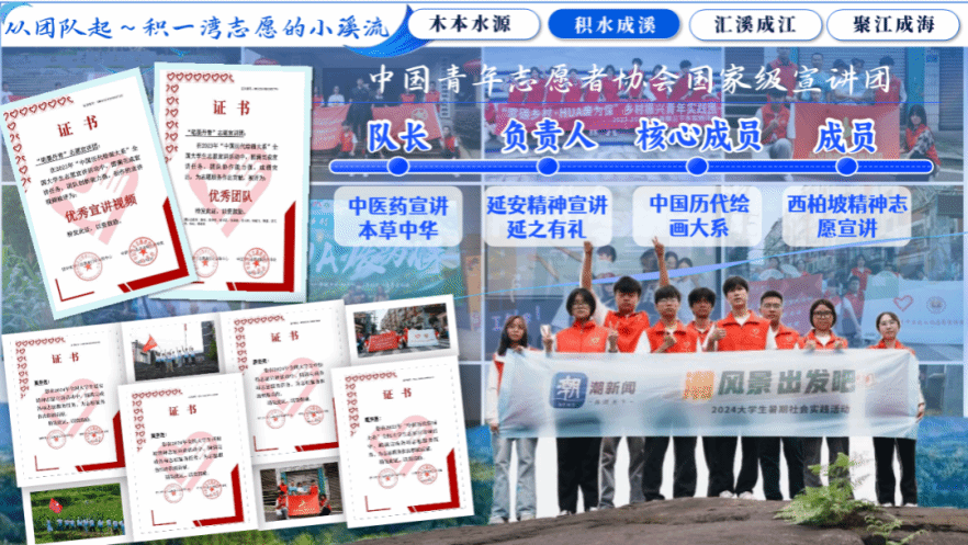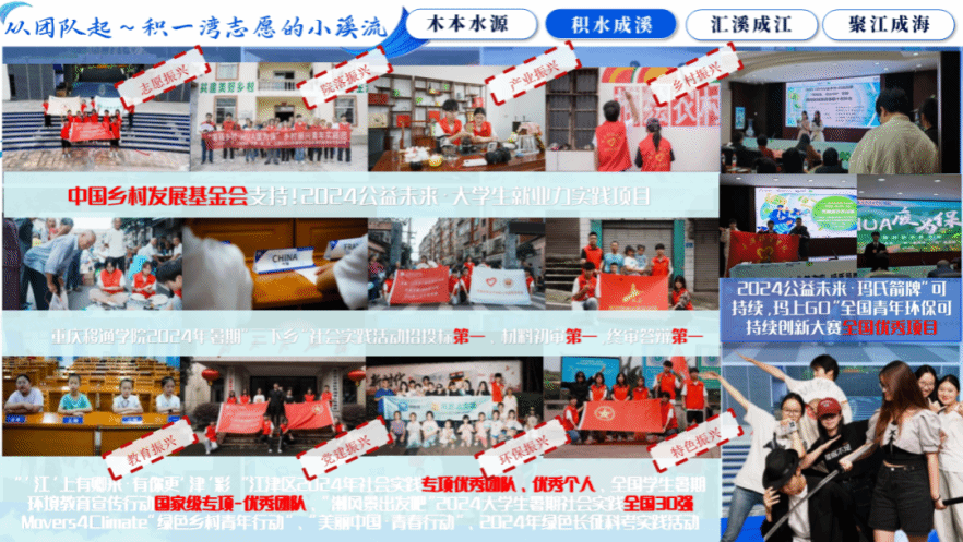 积水成溪,用200余天的沉淀,从2024公益未来·玛氏箭牌“可持续,玛上go”公益实践大赛全国50强到中国乡村发展基金会支持的2024公益未来·大学生就业力实践项目“15强优秀团队”,落地于重庆移通学院2024年暑期“三下乡”社会实践活动并获得招投标第一、材料初审第一,终审答辩第一的优异成绩,十大专项,全程参与并统筹江津区西湖镇为期14天的实践活动。通过实际行动实现“受教育、长才干、作贡献”的目标。