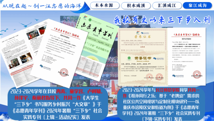 海浪翻涌的时候,是光驻足的时候。2023-2024学年在我校冉涛、童学容、卢柯毓、孙泽宇、秦丽君等老师的指导下,共同一作《大学生“三下乡”书写服务乡村振兴“大文章”》荣获《志愿青年学刊》总第二十二期|2024年暑期“三下乡”社会实践专刊(上辑-活动纪实)优秀奖,于长江师范学院同学共同一作《祖孙同行之乐:基于“老携幼”需求的社区公共空间现状与定制化模块研究——以重庆市涪陵区义和街道为例》荣获《志愿青年学刊》总第二十三期|2024年暑期“三下乡”社会实践专刊(下辑-调查研究)一等奖,皆于《志愿青年学刊》2024年暑期“三下乡”社会实践专刊发表,成为我校有史以来三下乡入刊的佳绩。