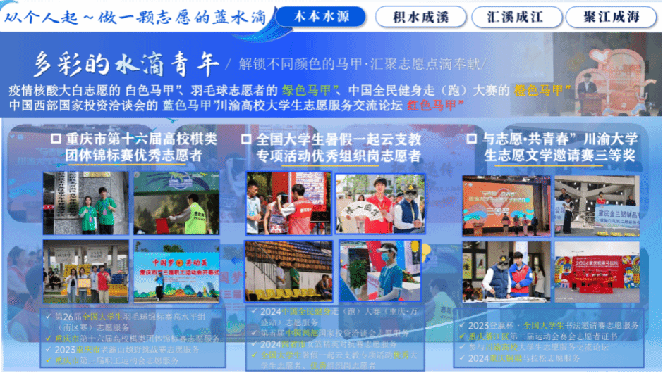 青春无悔,志愿无疆,是水滴,是希望。是疫情核酸大白志愿的“白色马甲”、是全国大学生羽毛球锦标赛的“绿色马甲”、是中国全民健身走(跑)大赛的“橙色马甲”,是中国西部国家投资洽谈会的“蓝色马甲”,是川渝高校大学生志愿服务交流论坛“红色马甲”,每一种颜色都是一次经历,每一种颜色都是一次成长。