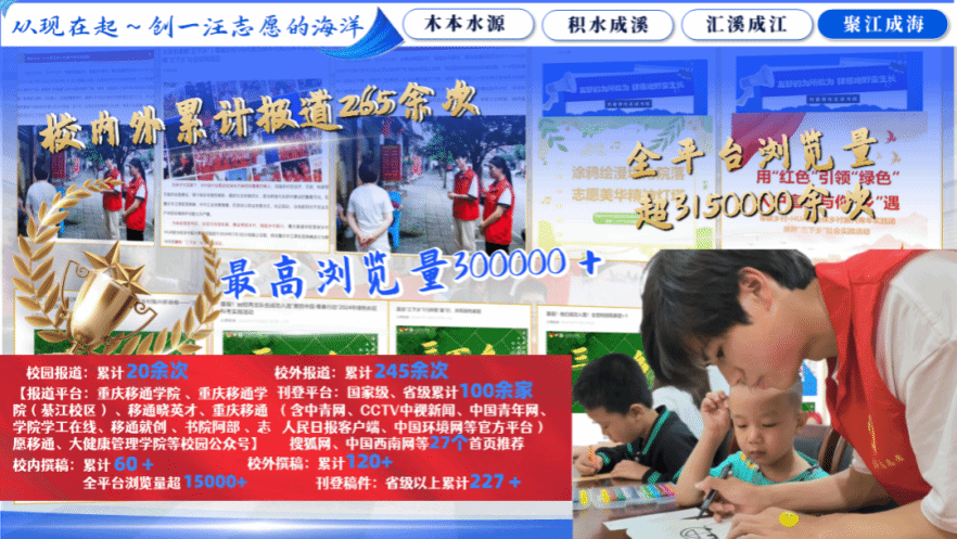 校内铸就榜样力量,校内撰稿六十余篇,全平台浏览量达五位数。校外多方联动,在中国青年网、人民日报客户端、中国环境网、CCTV中视新闻等100余家国家级、省级媒体刊登宣传件,累计刊登省级以上稿件227加,总计稿件120加,全平台浏览量超315万。