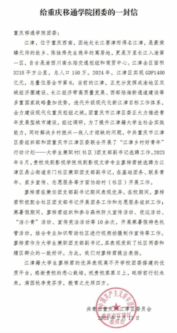 2025年2月17日,校团委收到重庆市江津区团区委发来的一封表扬信,信中写到:“廖梓君被选聘为江津区鼎山街道东门社区兼职团支部副书记,在基础团务、联系青年、家乡宣传、志愿服务等方面协助村(社区)开展工作,其表现受到了社区两委和辖区群众的一致好评。为此,我们对廖梓君提出表扬。”